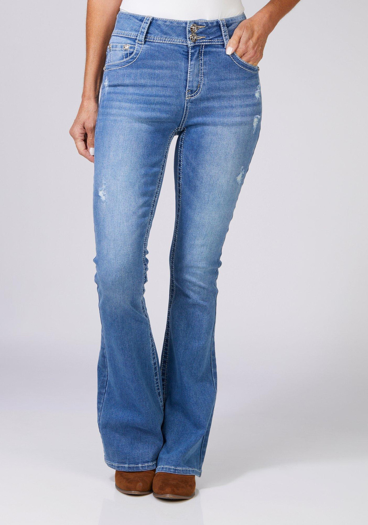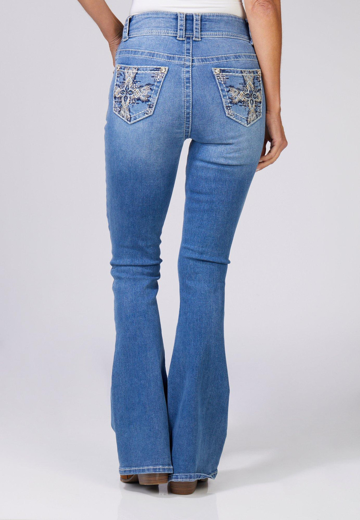 Elevate your denim game with these Juniors Cross Bling High Rise Flare Jeans. Featuring a stylish cross design with rhinestone accents on the back pockets, a classic button fly zip closure, and a flattering five pocket flare fit, these jeans blend bold detail with everyday comfort.