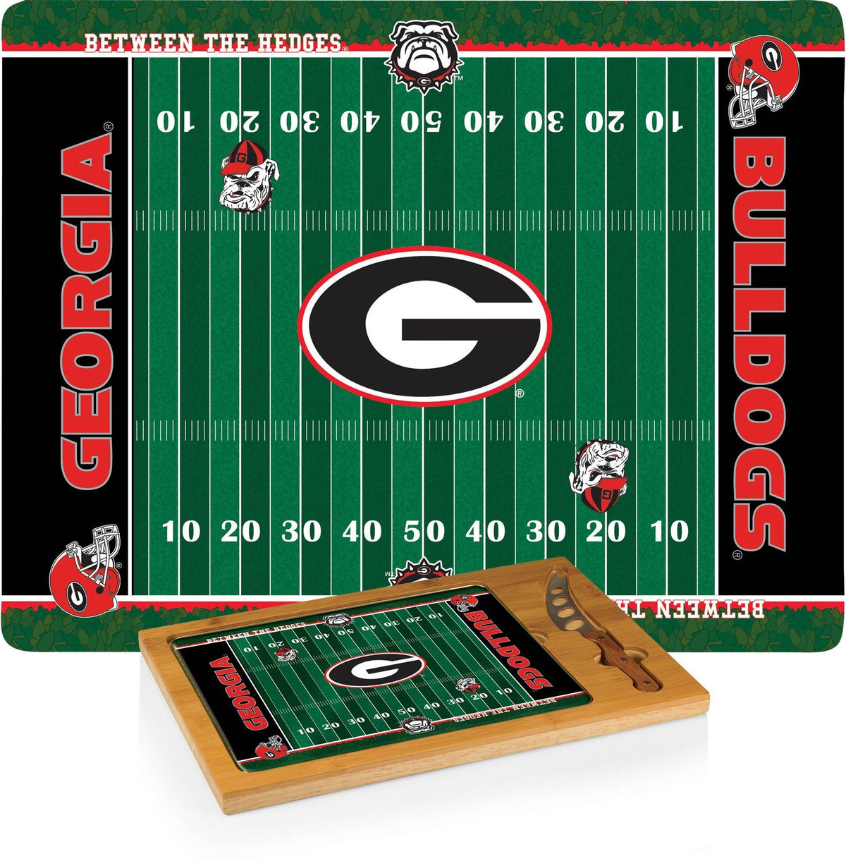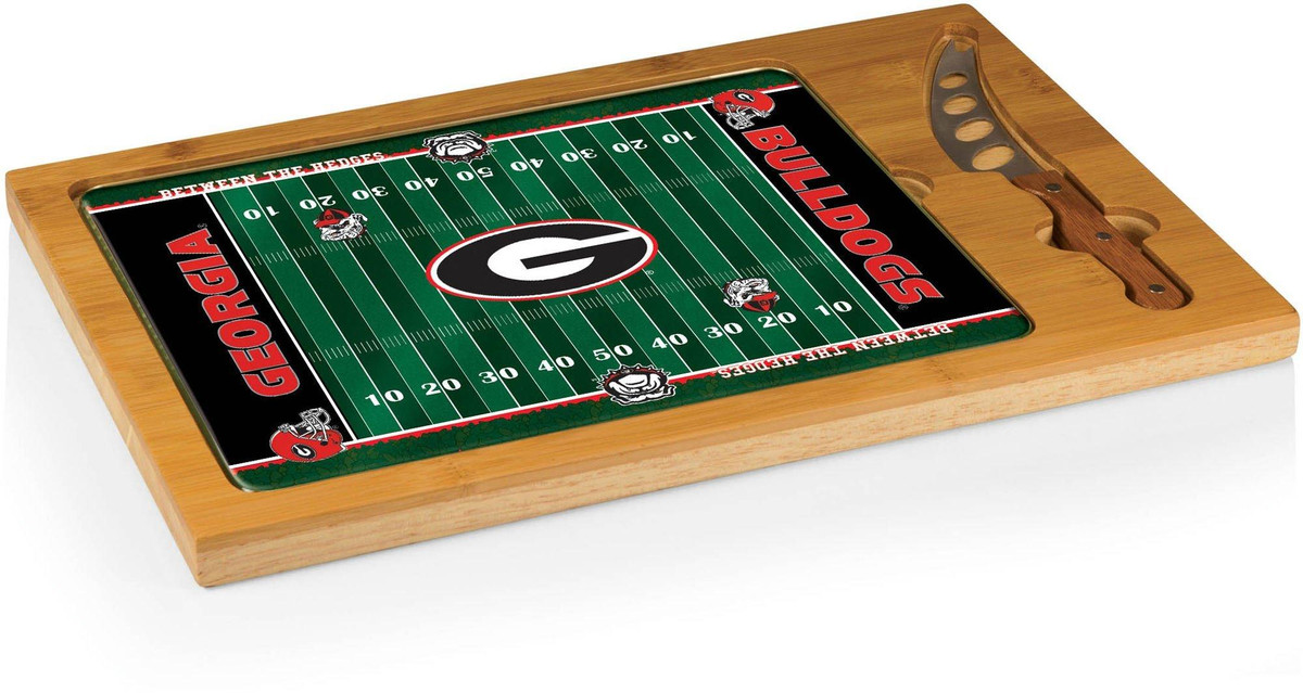 The Icon Georgia Bulldogs Cutting Board is a 3-pc. set that has a solid rubberwood base with a bamboo rim accent, a tempered glass lid, & a cheese knife with its own carved out area in the wood base. Measures 15.2”L x 10”W x .8”H.
