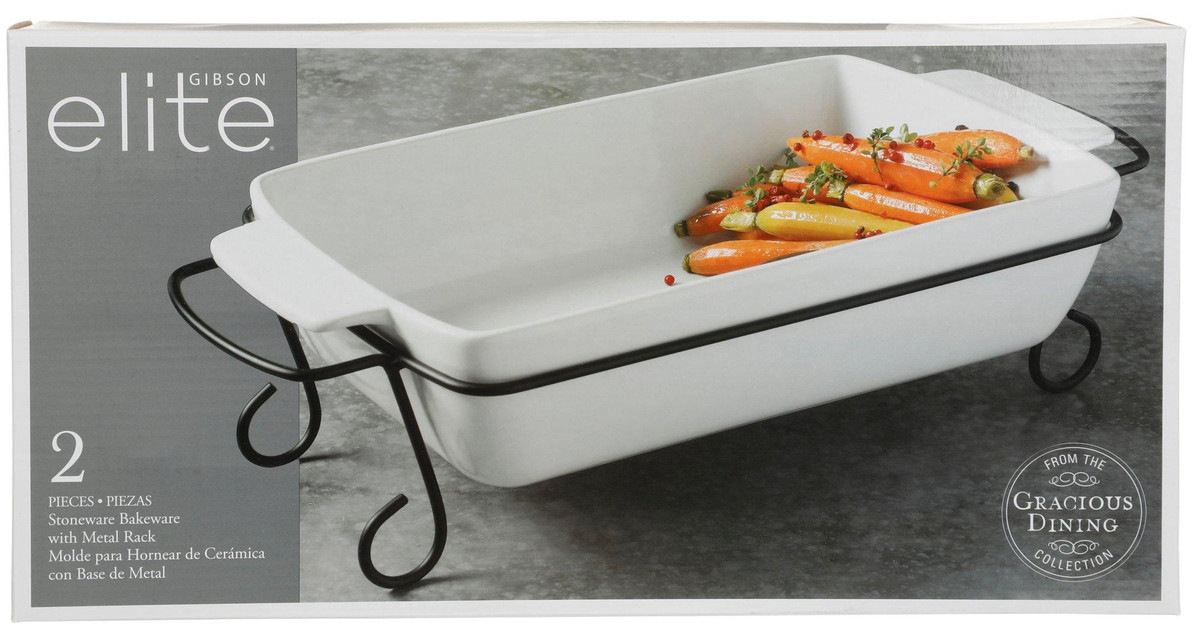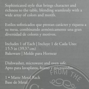 Enhance your baking experience with this 2 Pc Stoneware Bakeware Set. The set includes a durable stoneware dish, measuring 15.5 inches in length, and a sturdy metal holding rack. Perfect for baking and serving, the stoneware dish ensures even heat distribution for perfectly cooked meals, while the metal rack provides easy handling and a stylish presentation. Ideal for any kitchen, this bakeware set combines functionality and elegance, making it a must-have for your culinary creations.