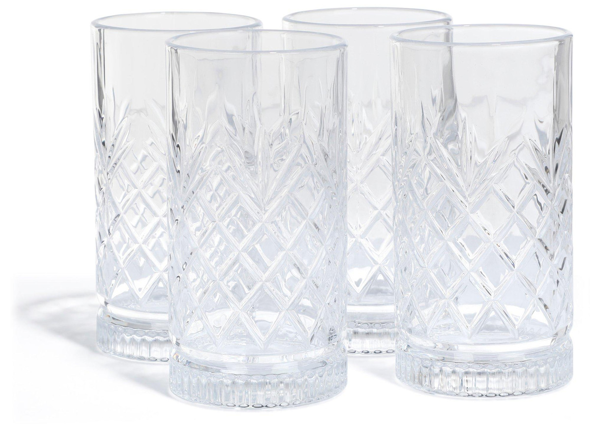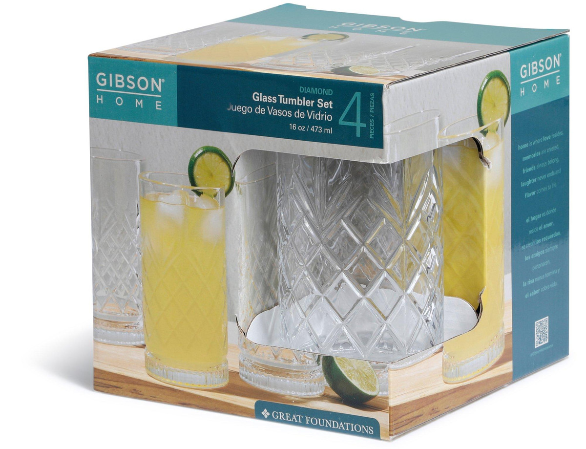This 16 Ounce Diamond Tumbler Set from Gibson Home is designed with a teardrop shaped embossed exterior that sparkles with brilliance and clarity. Perfect for serving iced teas, cocktails, or any beverage of your choice, each piece complements any style of table setting. Whether you are celebrating with friends or enjoying a casual drink, this set will add a special touch to the occasion. Durable glass construction is dishwasher safe for easy cleanup.