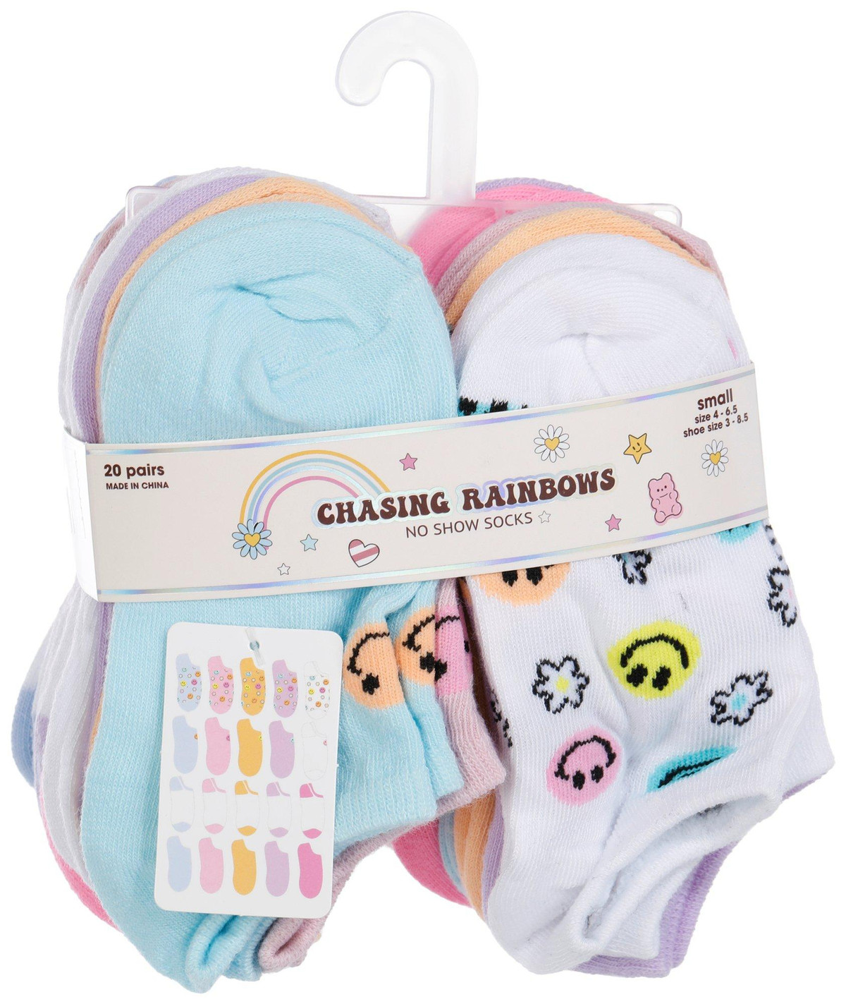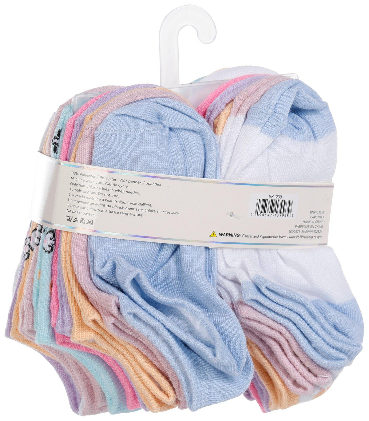 Add playful variety to every step with this 20-pack of girls no show socks, each featuring a unique pattern. Designed for all-day comfort, these low-profile socks offer a snug fit that stays in place and pairs easily with sneakers or slip-ons. From stripes to stars, hearts to polka dotstheres a fresh design for every outfit and mood.