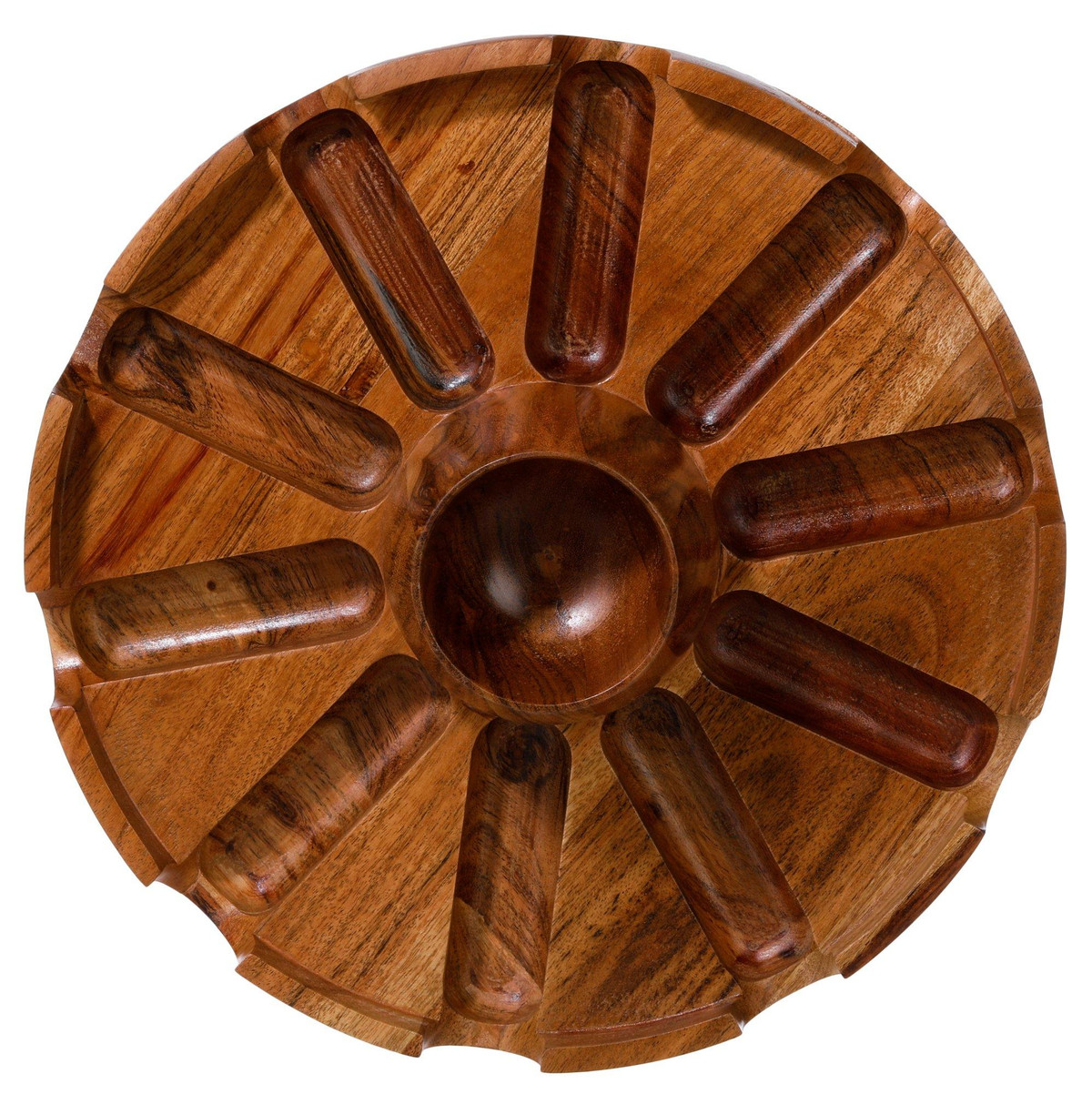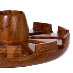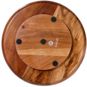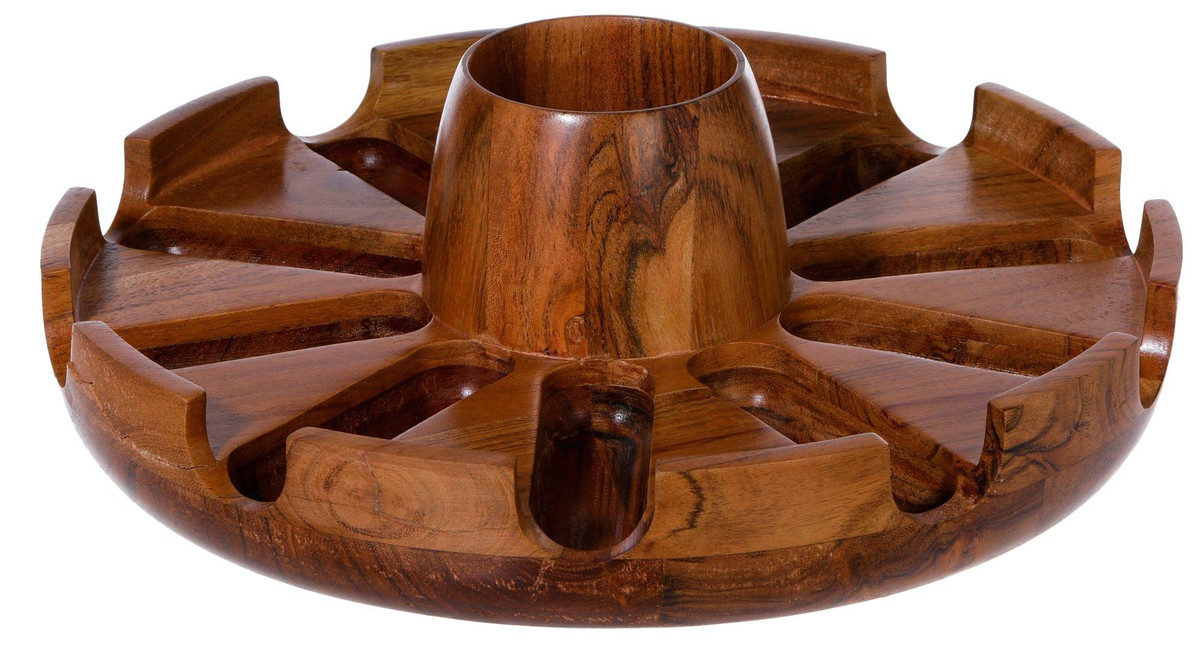 This wooden lazy susan is shaped like a sombrero and designed to hold tacos with festive flair. Perfect for taco night, this rotating server adds fun and function to the table. The unique shape offers convenient access to shells and toppings, making mealtime interactive and easy. Measures 12.25 in x 12.25 in x 4.75 in.