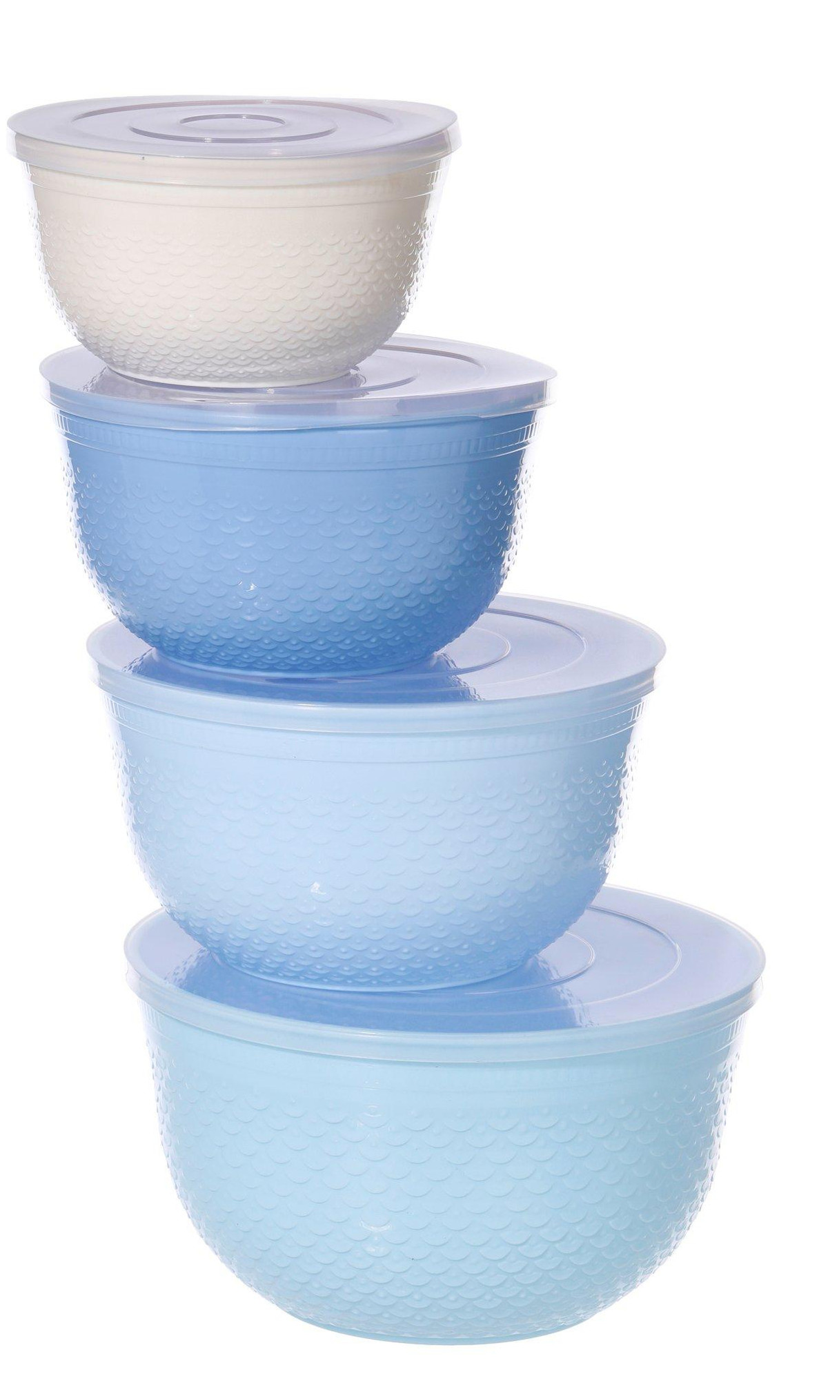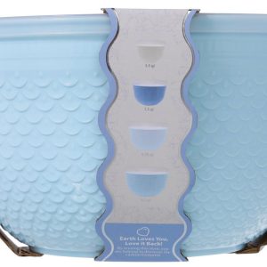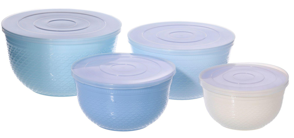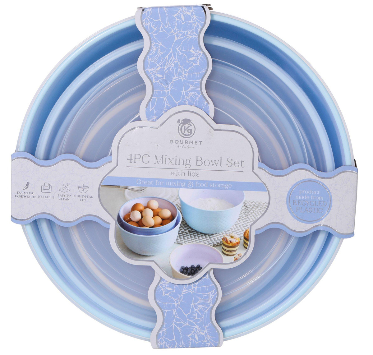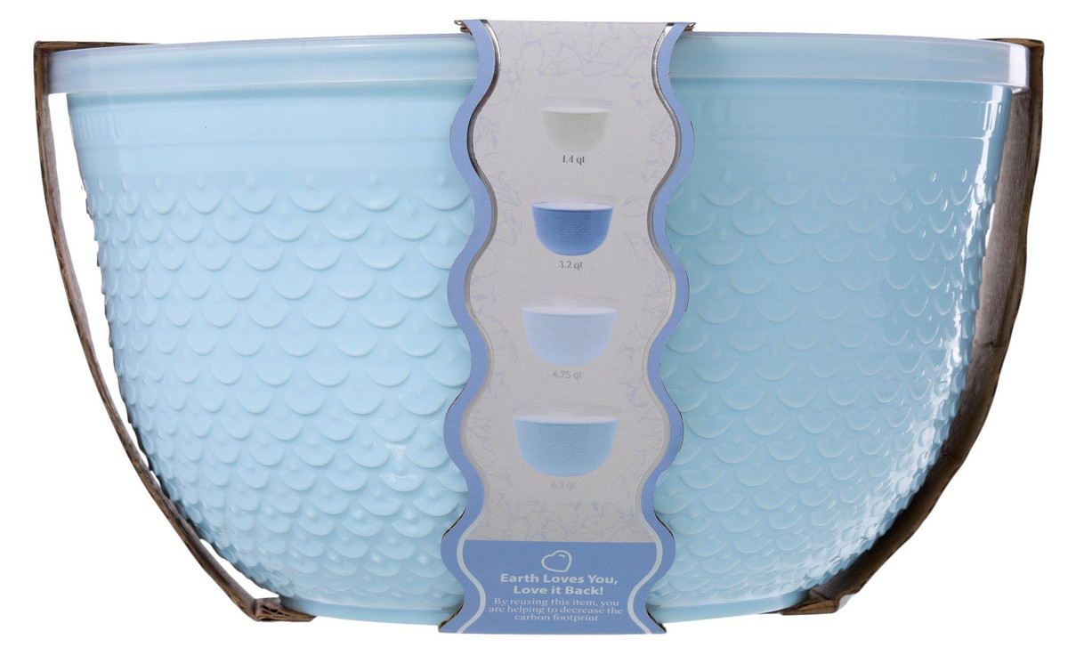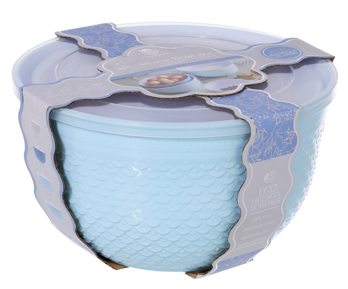 This 4 piece mixing bowl set includes four durable bowls with matching tight seal lids, perfect for mixing and food storage. Made from recycled plastic, this eco friendly set is free of PBA, phthalate and melamine. Bowls nest for easy storage and are simple to clean, making everyday prep more efficient. This set offers a safe and sustainable solution for busy kitchens. Includes one 1.4 QT, one 3.2 QT, one 4.75 QT, and one 6.3 QT bowl.