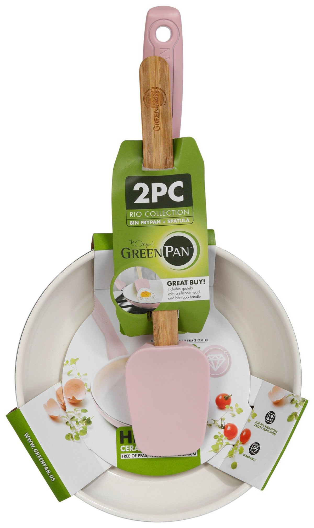 Elevate your everyday cooking with this versatile frypan set, perfect for scrambles, veggie sautés, and crispy fried fish. Featuring Thermolon healthy ceramic nonstick coating, these pans offer effortless food release and easy cleanupcompletely free of PFAS, PFOA, lead, and cadmium. The durable construction ensures even heat distribution, while the stay-cool handles provide a secure, comfortable grip on any stovetop. Includes spatula with a silicone head. Measures approximately 8 in.