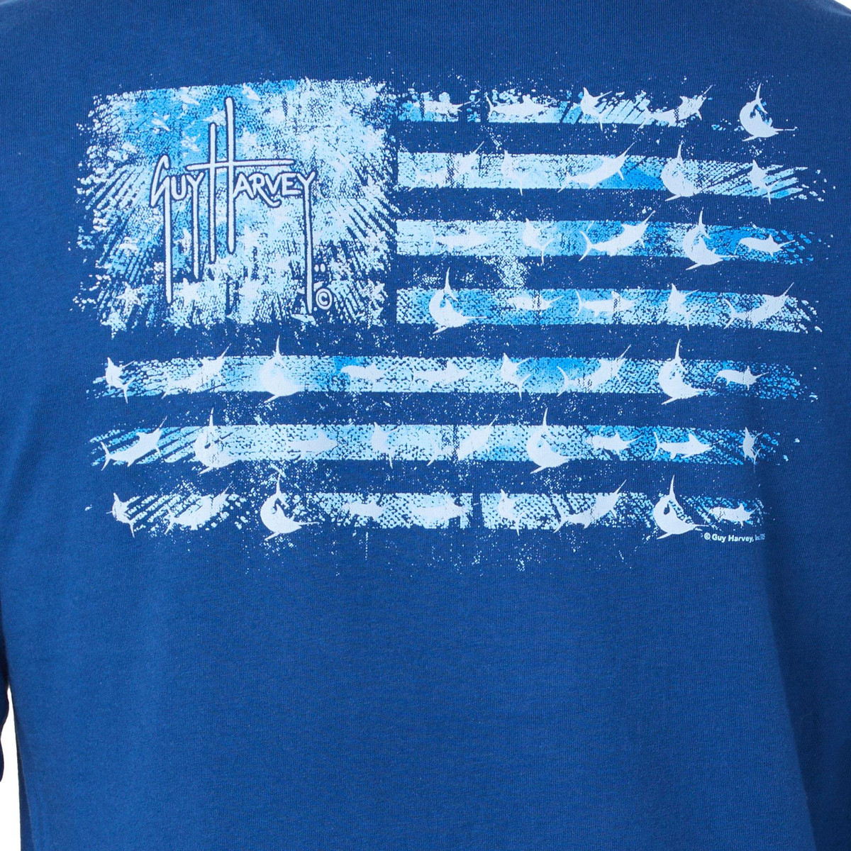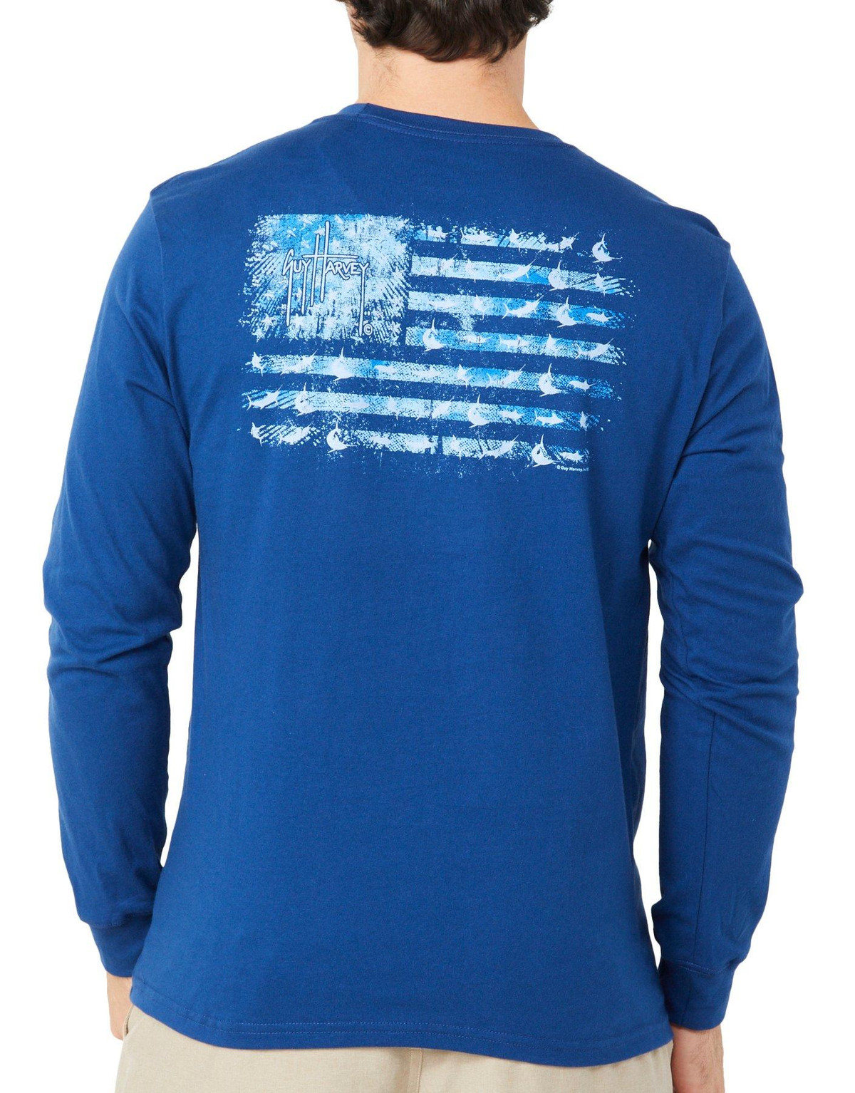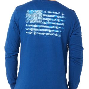 This men’s long sleeve tee features an all cotton build with a tonal USA flag graphic on the back. Designed for soft comfort and understated patriotic style.