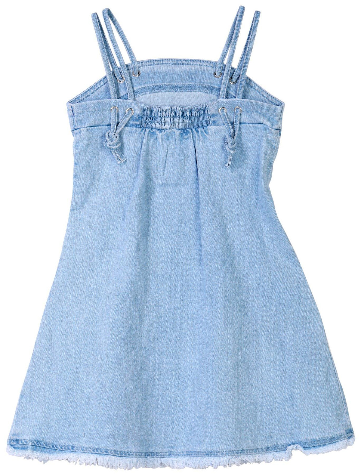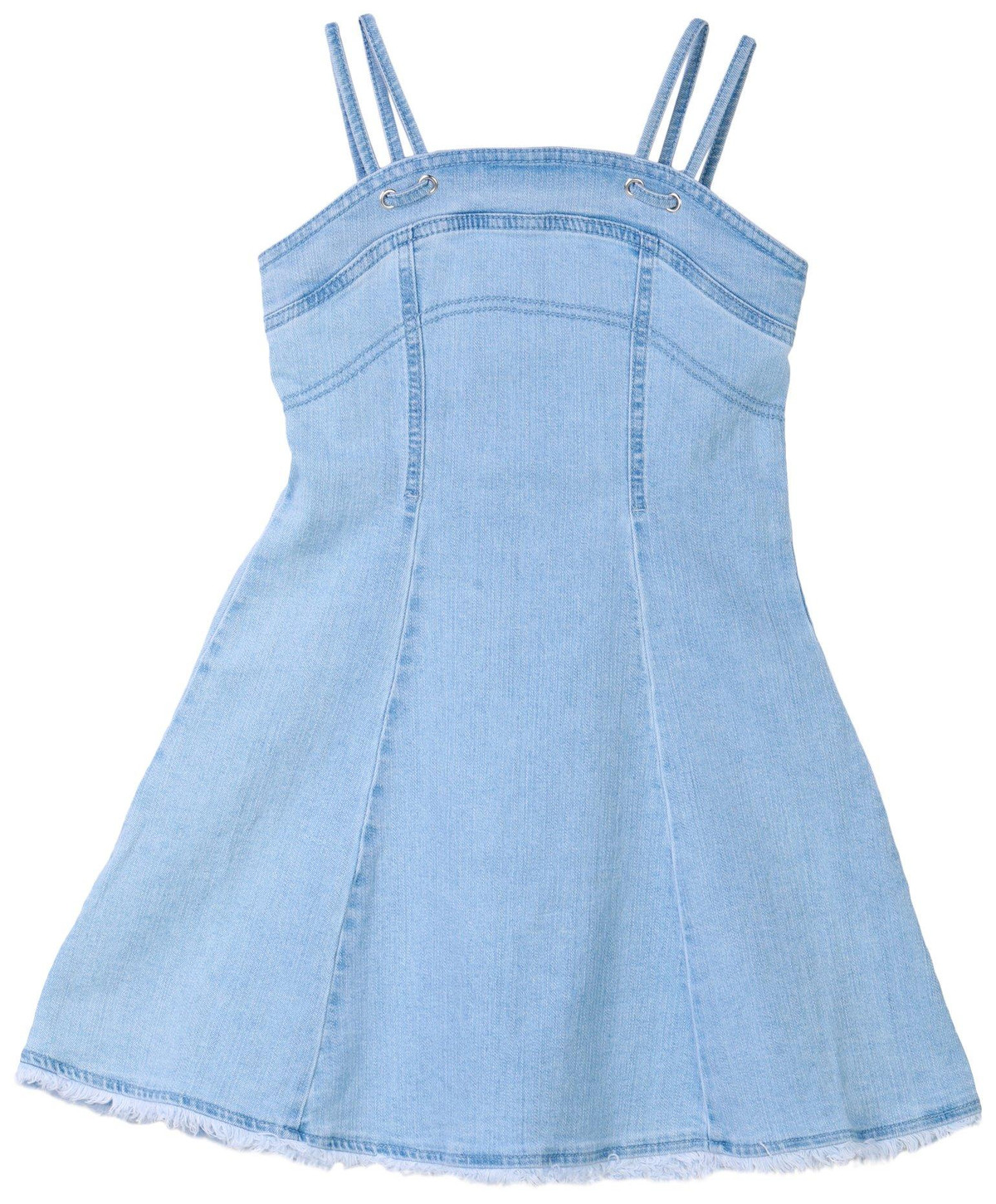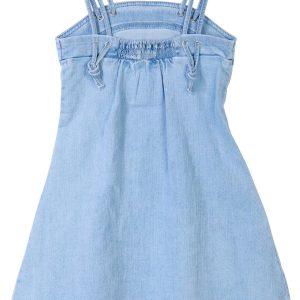 Add casual charm with the Girls FitNFlare Denim Dress with spaghetti straps crafted from stretch denim fabric. The flattering fitandflare silhouette offers ease of movement while maintaining structure. Adjustable spaghetti straps and soft stretch ensure a comfortable fit for play or outings. Ideal for casual wear, park visits or everyday styling. Machine wash cold for easy care.