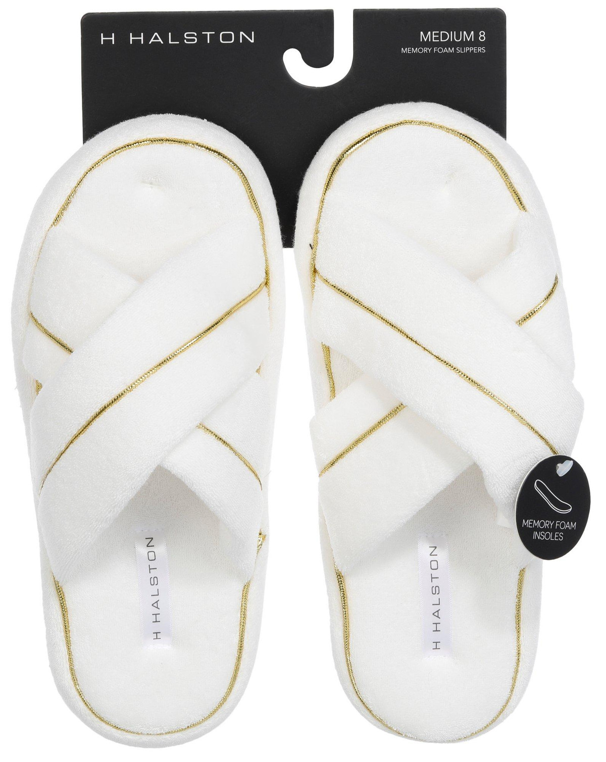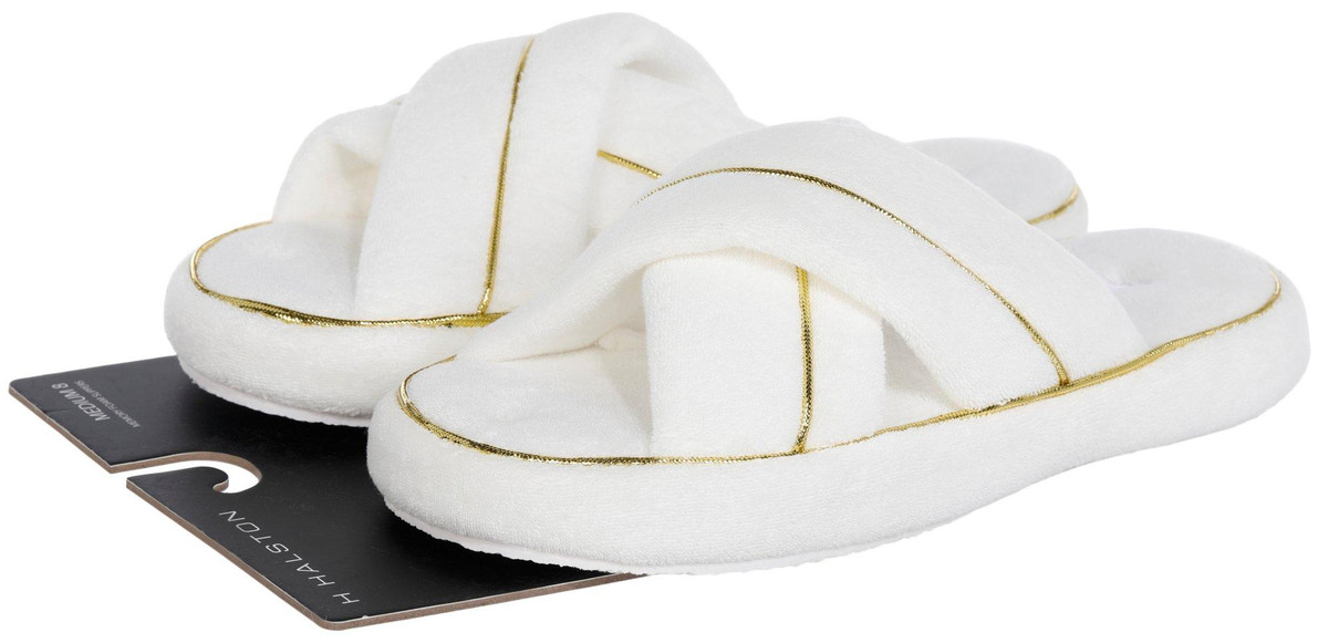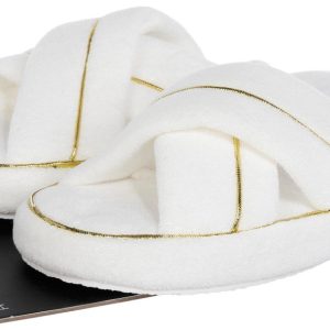 Everyday Slippers feature a chic cross-band design in soft towel-like fabric with elegant gold trim. Crafted in white, they offer memory foam insoles for cushioned comfort and support. Perfect for daily wear, these slippers combine spa-inspired style with cozy functionality, making them ideal for lounging at home in effortless sophistication.