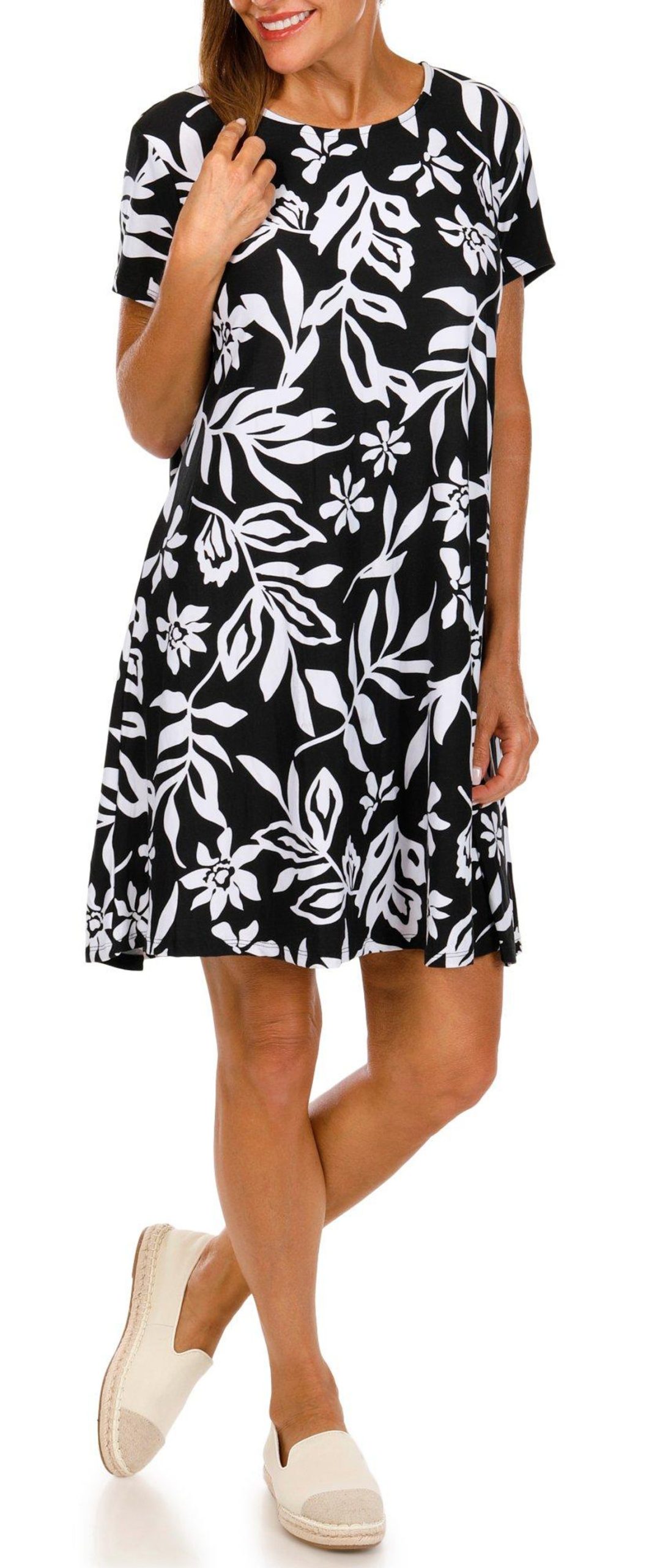 The Women’s Short Sleeve Swing Dress combines comfort and style with its flowy silhouette and tropical print. Designed to flatter every body type, this dress offers a relaxed fit and soft fabric that moves with you. Perfect for warm weather, it is ideal for casual outings or dressing up for special occasions. Fabrication is 92% polyester, 8% spandex.