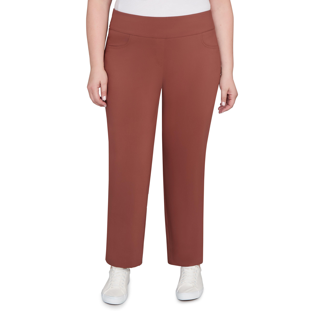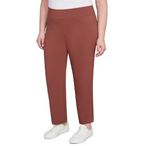 Stay confident in Hearts of Palm Solid Tech Stretch Ankle Pants. With a flat front and pull-on styling, they feature tech stretch fabric and built-in tummy control for a smooth, flattering fit. Perfect for work or weekends, they easily dress up or down for a versatile fall style. Pant length measures 29 in. Fabrication 78% rayon, 19% nylon, 3% spandex.