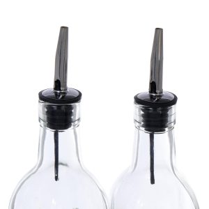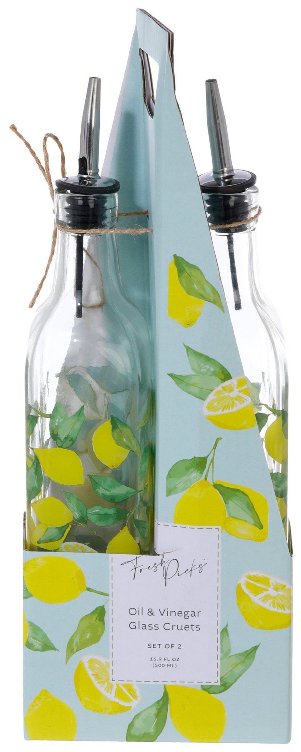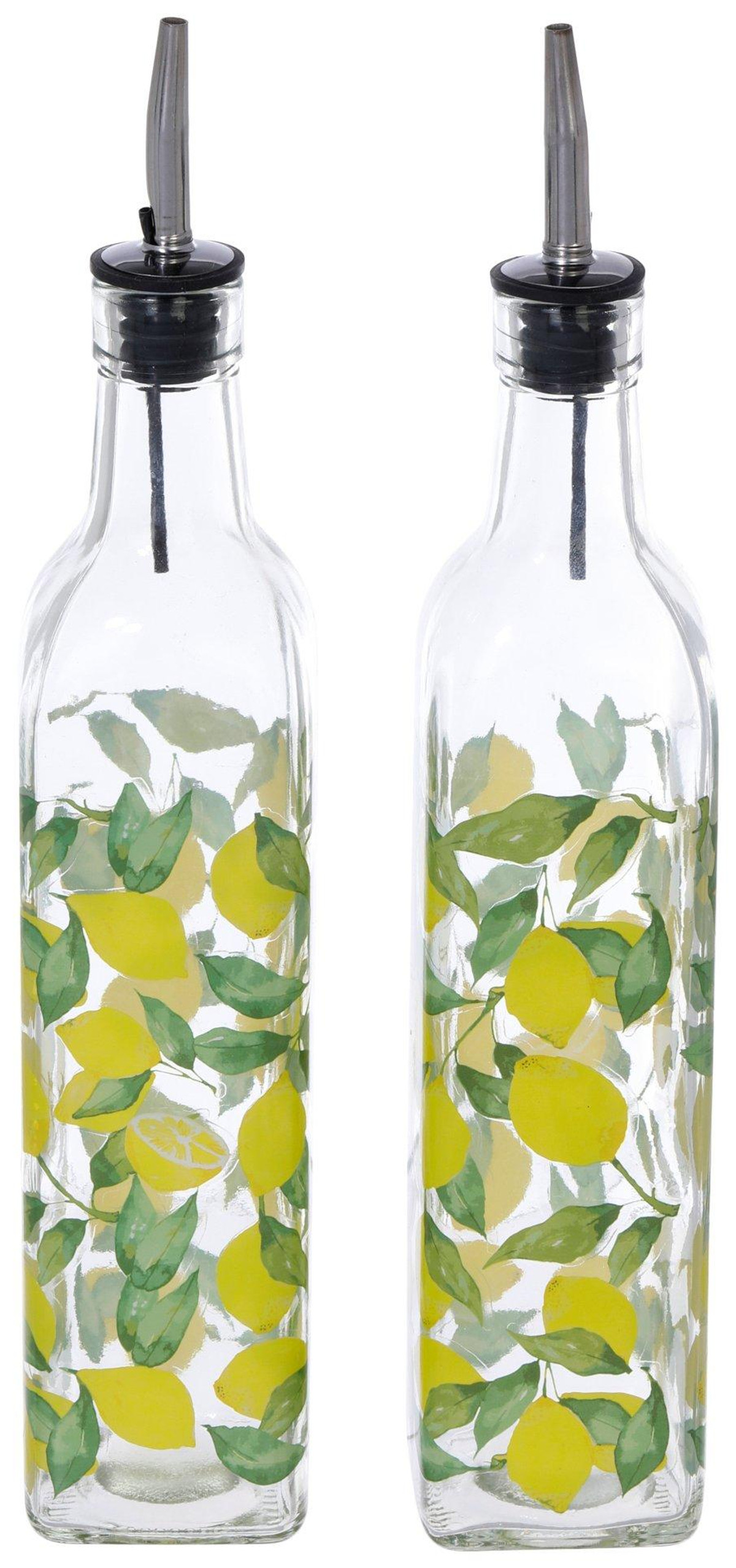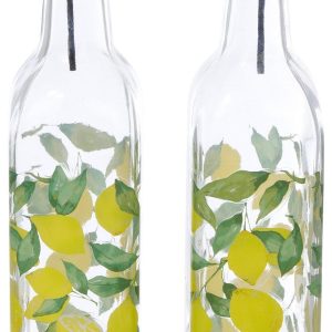 This oil and vinegar cruet set features two 16.9 fl oz glass bottles adorned with a charming lemon pattern, adding a fresh and vibrant touch to your kitchen or dining table. Each bottle is crafted from clear glass for easy content visibility and is ideal for storing and serving olive oil, vinegar, or dressings. Functional and decorative, this set makes meal prep and presentation both stylish and convenient.