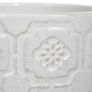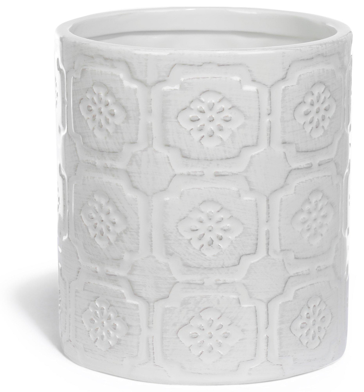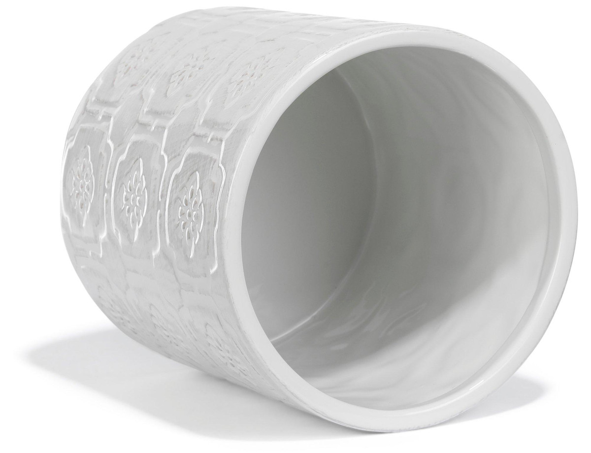 Organize your kitchen with the stylish Embossed Tile Utensil Holder Crock. This practical and elegant holder features a solid color that seamlessly blends with any decor. Its embossed tile design adds a touch of sophistication while keeping your utensils easily accessible. Made from durable materials, this holder is perfect for everyday use, ensuring your kitchen stays tidy and chic. Measures approximately 6 in x 7 in.