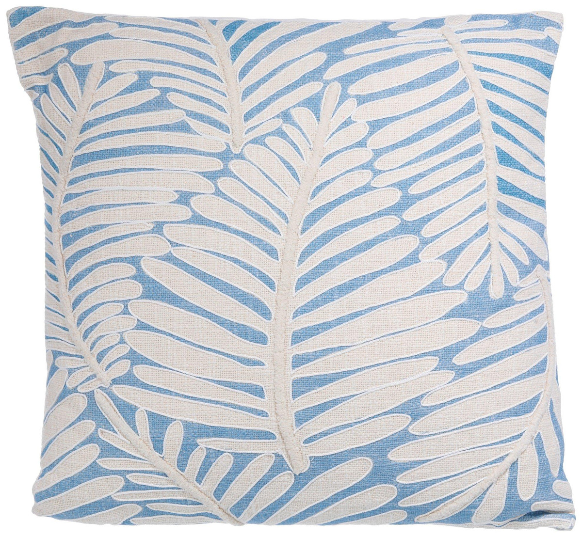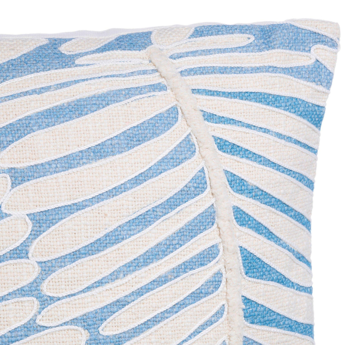 Bring a breezy, tropical vibe to your space with this stylish embroidered pillow. Featuring a soft light blue background and bold white palm leaf design, this square throw pillow adds a fresh, summery touch to any room. Perfect for coastal décor or a serene seasonal refresh. Measures approximately 18 in x 18 in.