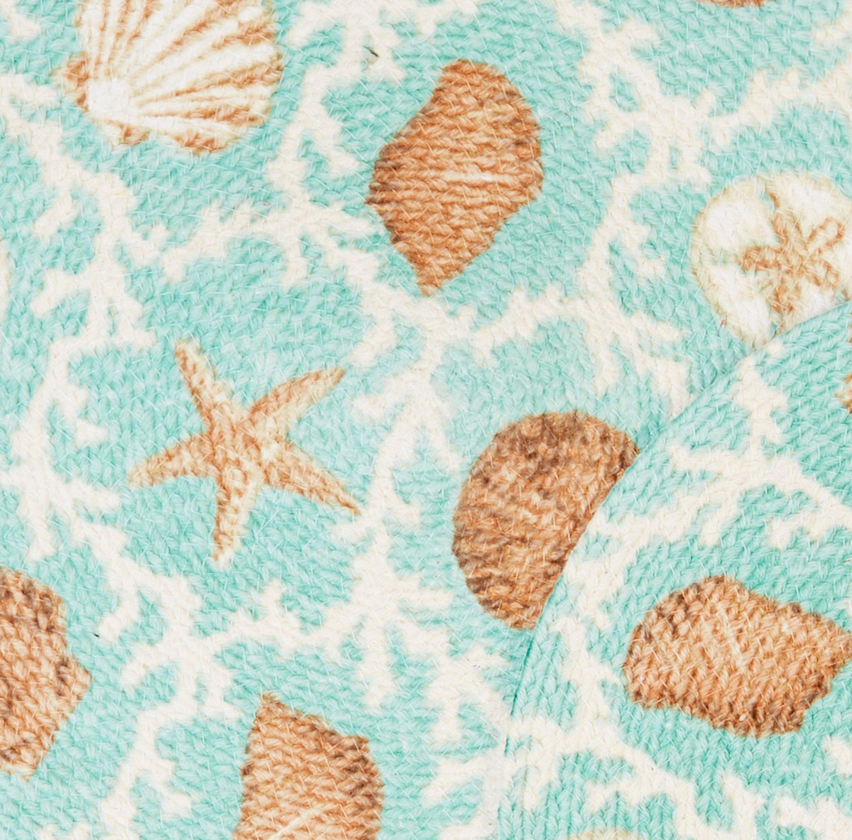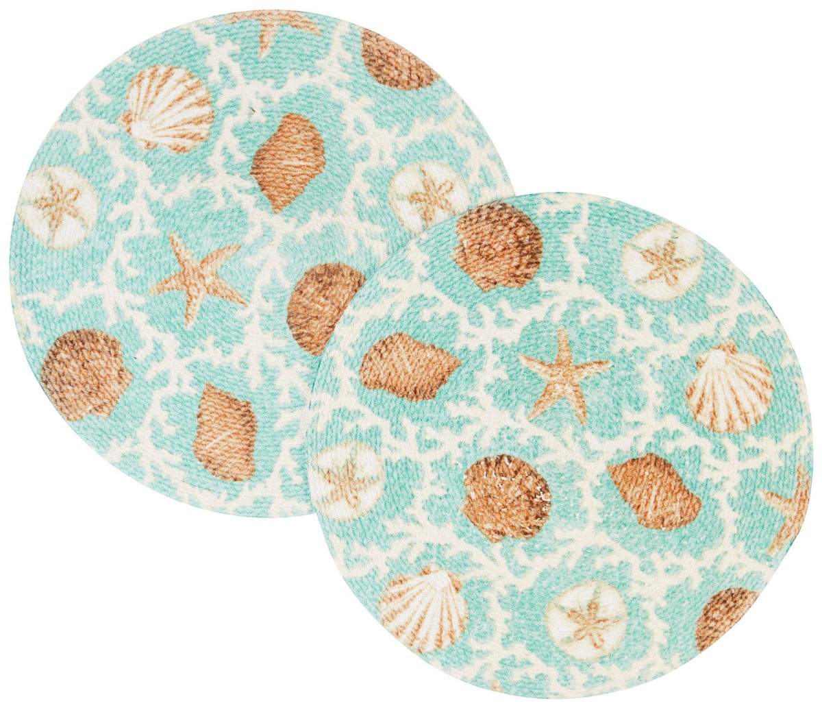 Homewear Linens provides table linens, kitchen textiles, and other fabric home accessories with fresh, innovative designs. This two pack placemat set features a fun coastal shell and sand dollar design. Each measures 15”Dia.