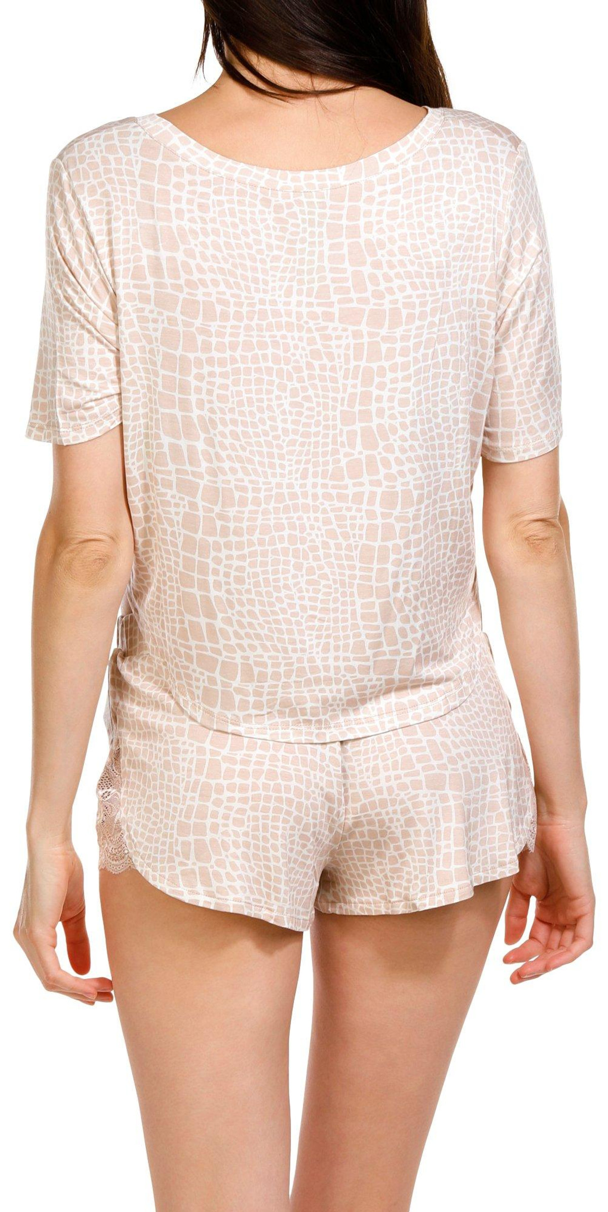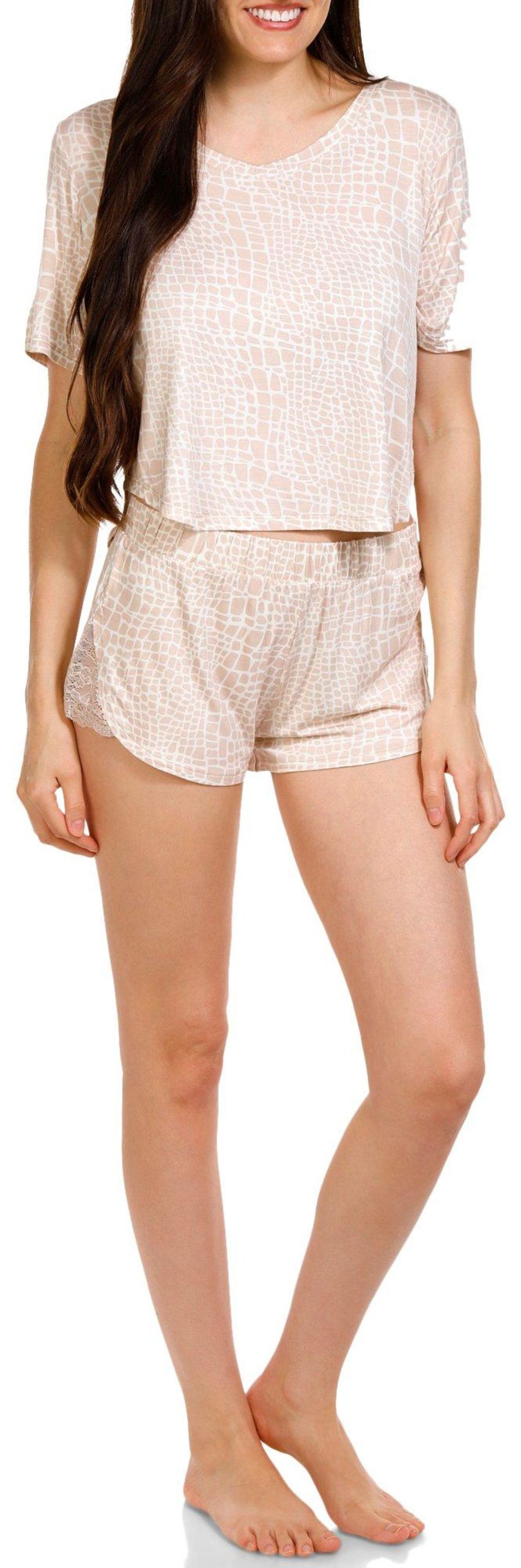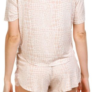 Introducing this 2-piece Sleepwear Set, a playful and comfortable addition to your nighttime wardrobe. This set features a trendy animal print pattern that adds a fun touch. It includes a short sleeve top and matching shorts, perfect for warm nights. Enjoy a cozy and stylish sleep with this delightful sleepwear set. Fabrication is 95% rayon, 5% spandex.