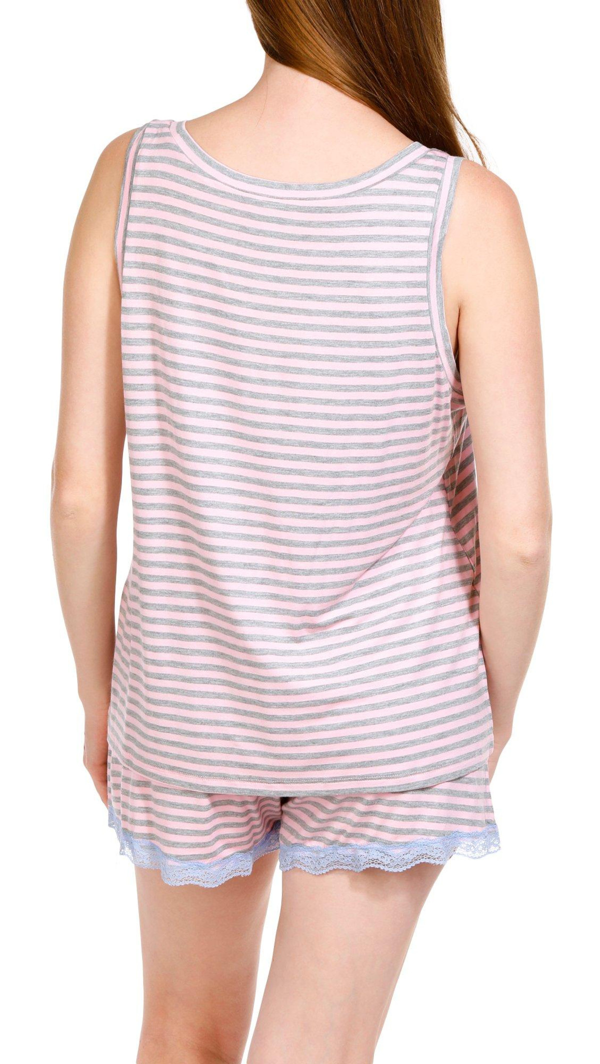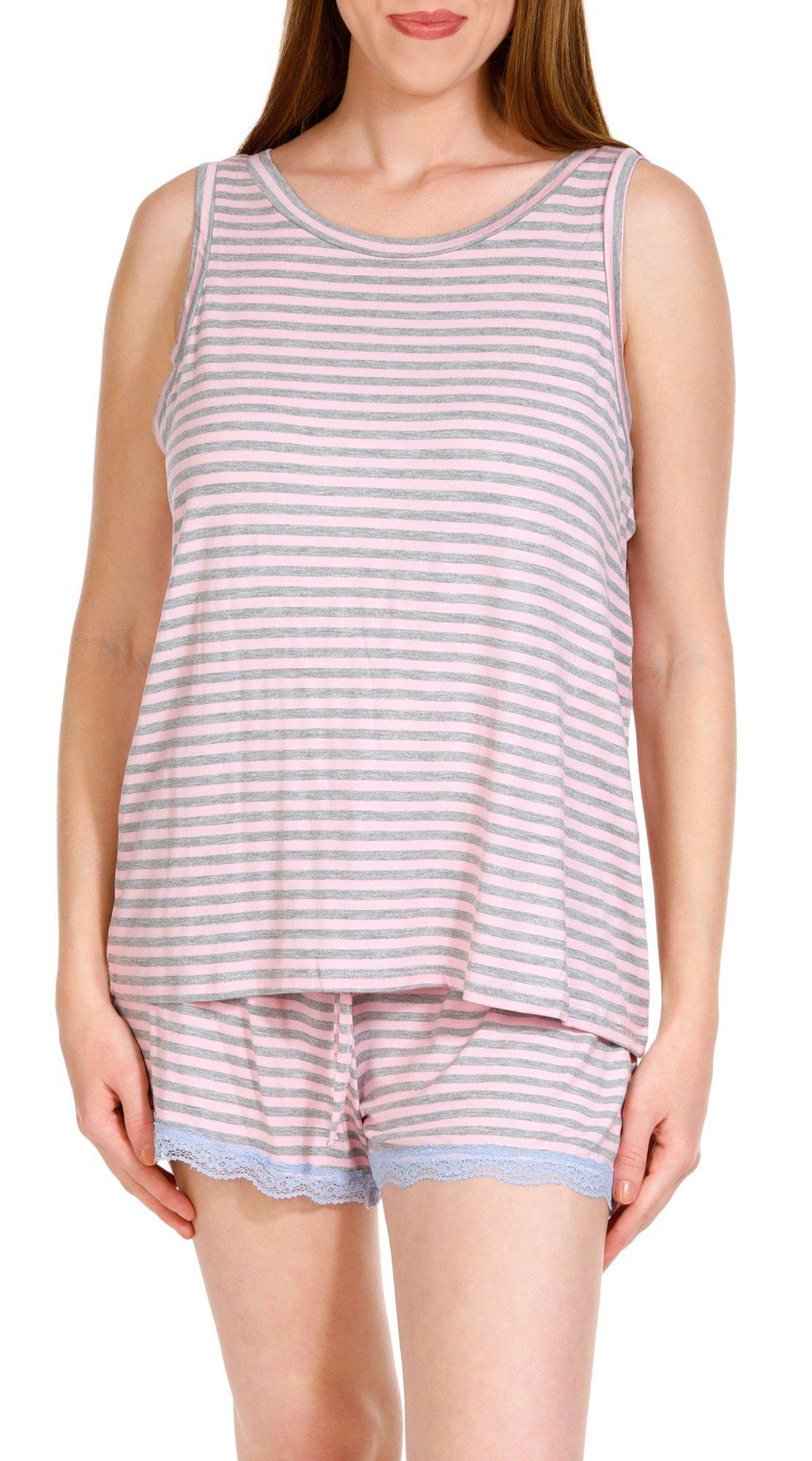 Introducing this 2 Piece Sleepwear Set, a delightful addition to your nighttime wardrobe. This set includes comfortable shorts and a sleeveless top, both featuring a charming striped print pattern. Perfect for warm nights, this sleepwear set combines style and comfort, ensuring you have a restful and cozy sleep. Fabrication is 95% rayon, 5% spandex.