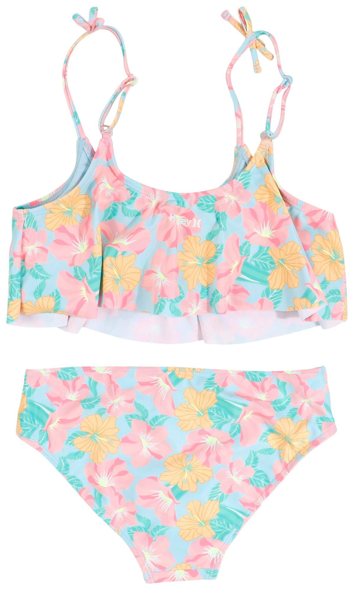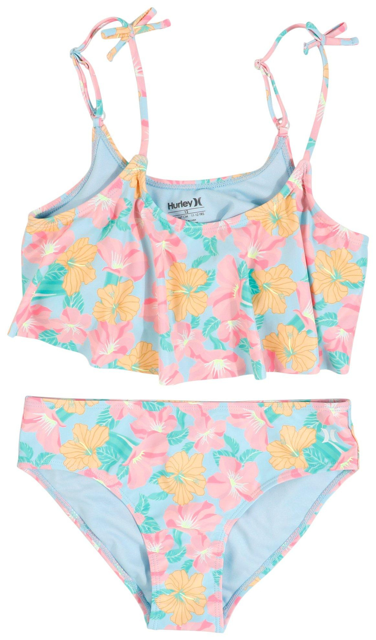 Introducing the Big Girls 2 Pc Hibiscus Bikini Set, crafted from a blend of polyester and elastane for a comfortable fit. This vibrant set features a tropical hibiscus print, with a flowy bikini top and matching bottoms. Perfect for sunny beach days or poolside fun, this bikini set combines playful style with practicality. UPF 50+ sun protection.