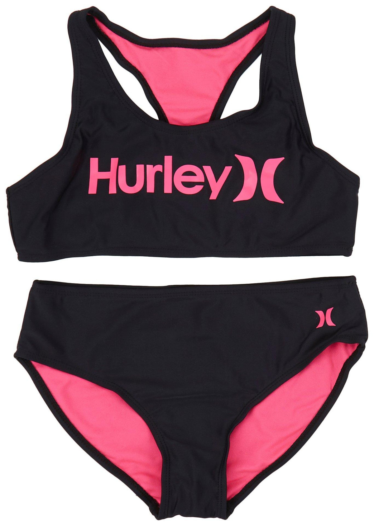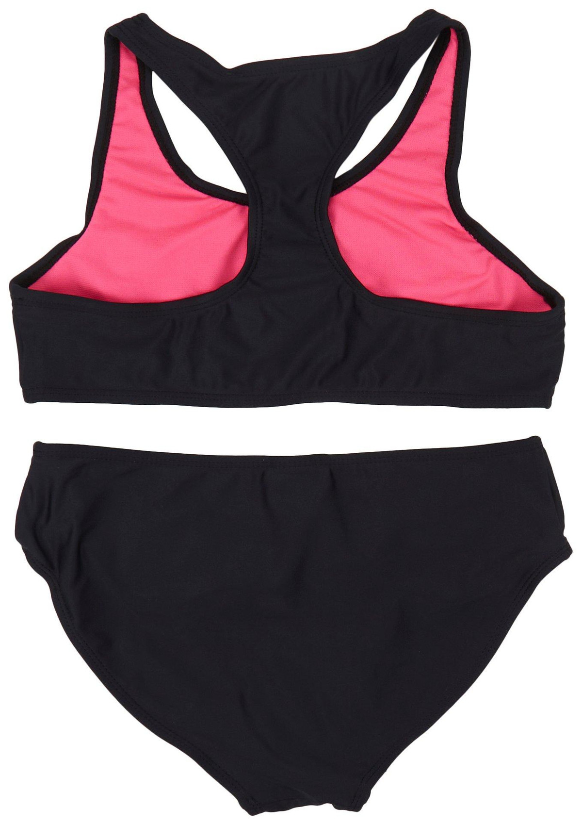 Introducing the Big Girls 2 Pc Racerback Bikini Set, designed for both style and comfort. Made from a blend of polyester and elastane, this set offers a perfect fit and durability. It features a chic brand script on the bikini top and matching brief bikini bottoms. Ideal for beach days or poolside fun, this bikini set combines fashion and functionality effortlessly.