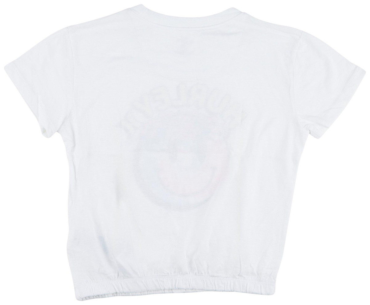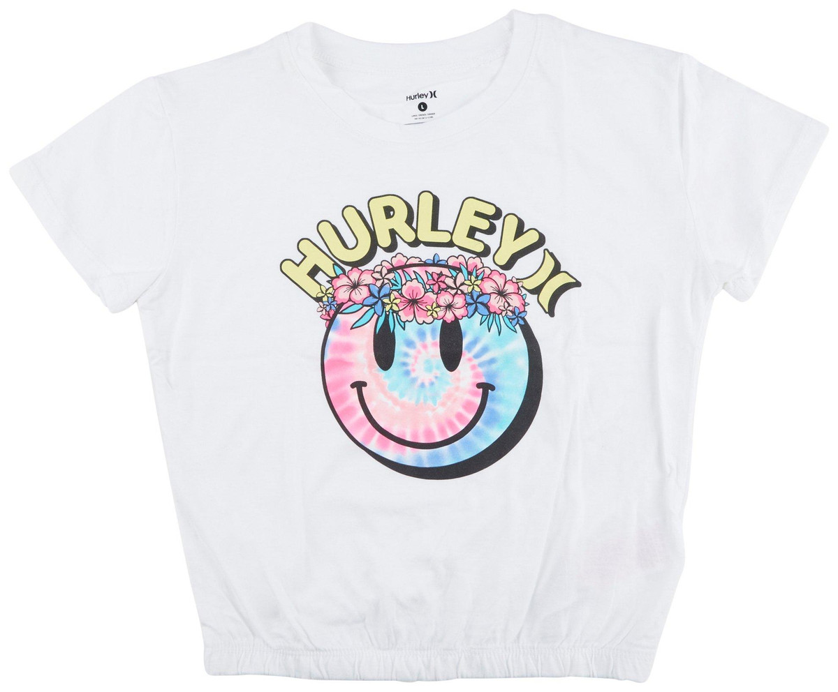 Hurley designs comfortable clothing with the ocean lover in mind. This tee features a solid color design on lightweight fabric, chest Screen print, a round neckline, and a cropped styling with elastic hem. Fabrication is cotton and polyester blend.