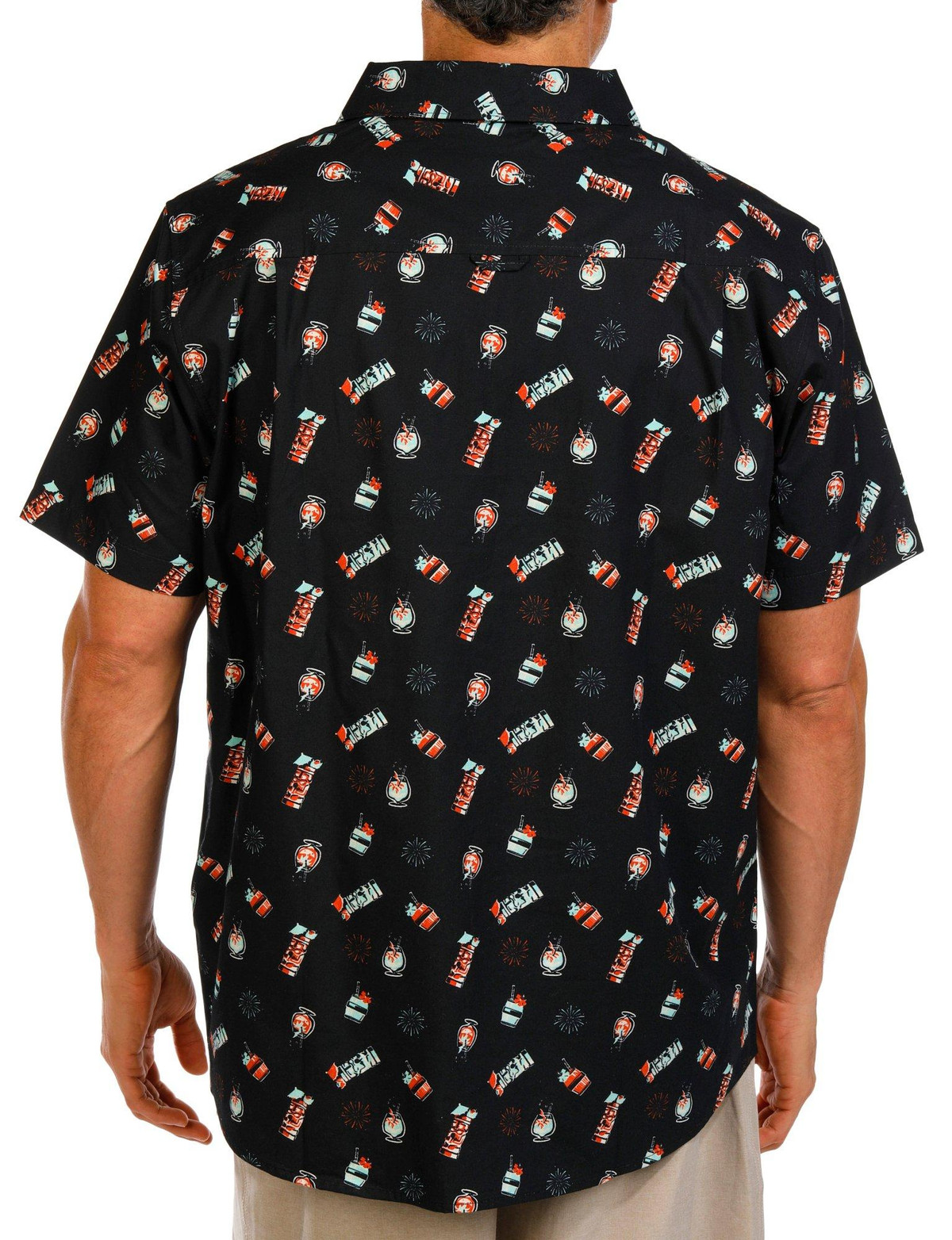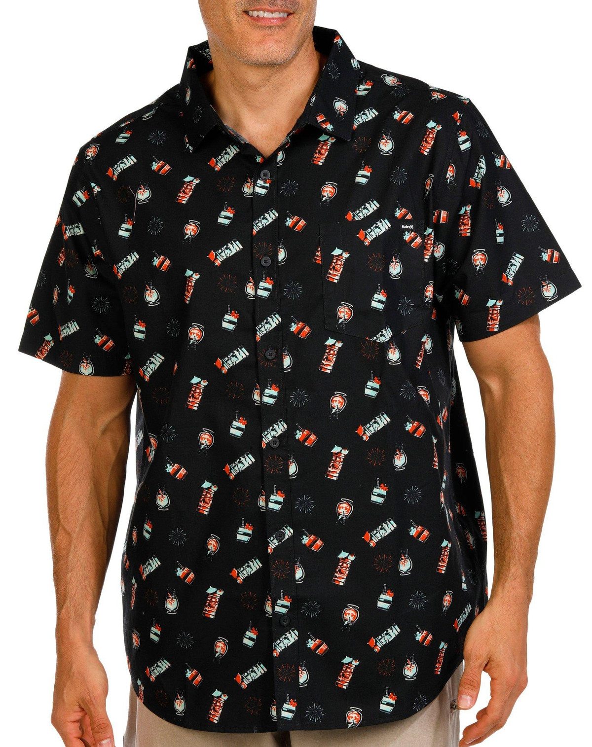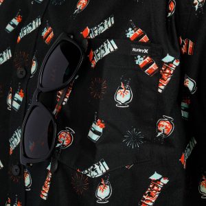 This short sleeve shirt features a vibrant tiki themed print, a buttoned front, and a chest pocket with a convenient sunglass slot. A fun and functional choice for sunny days and laid back gatherings.