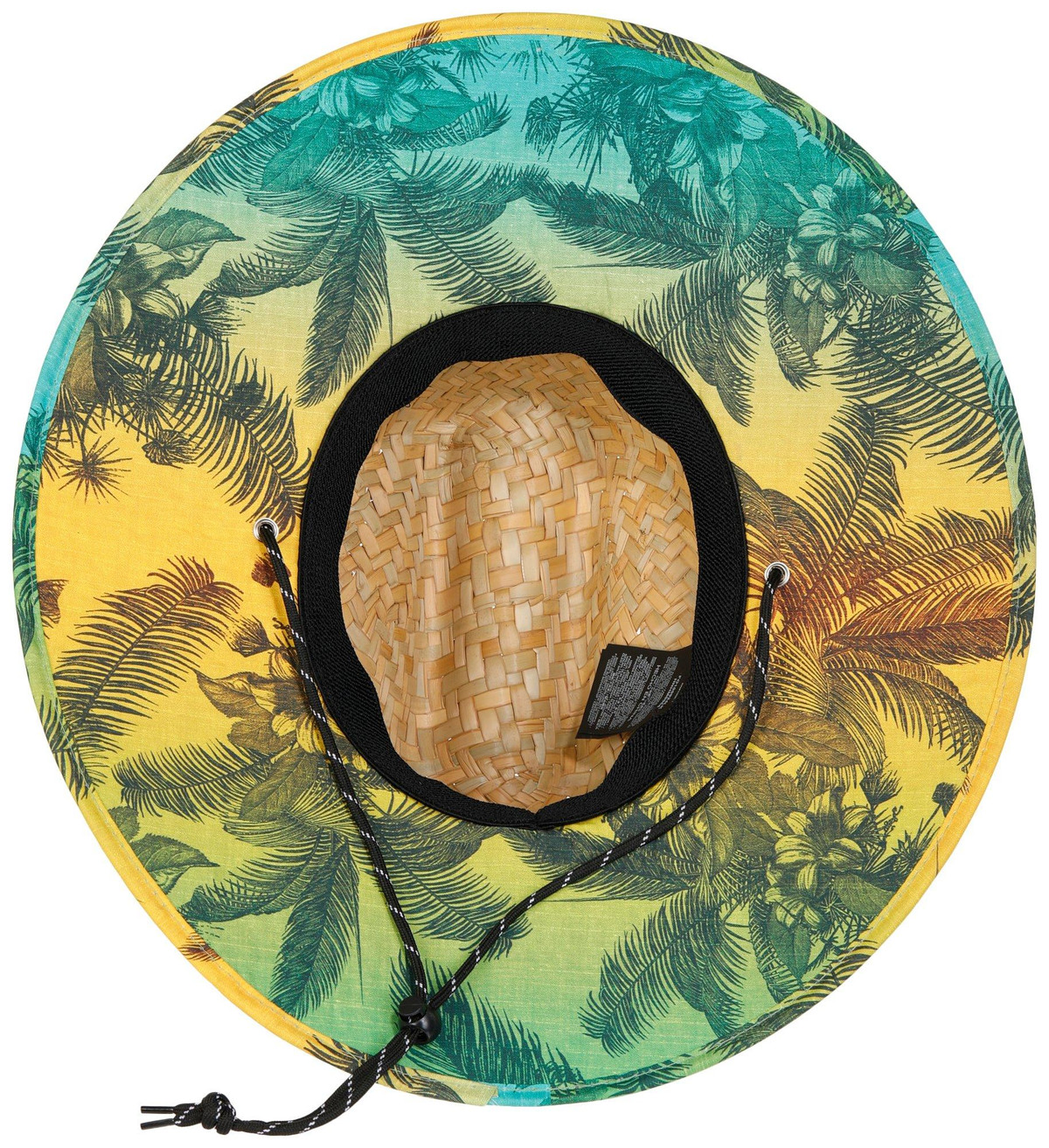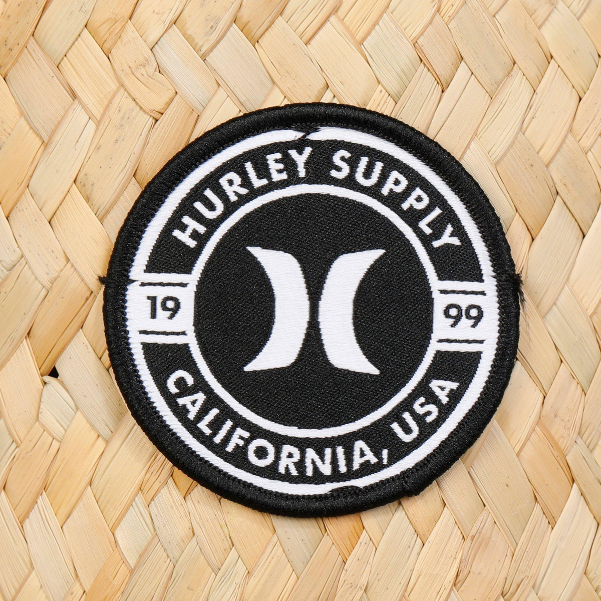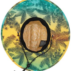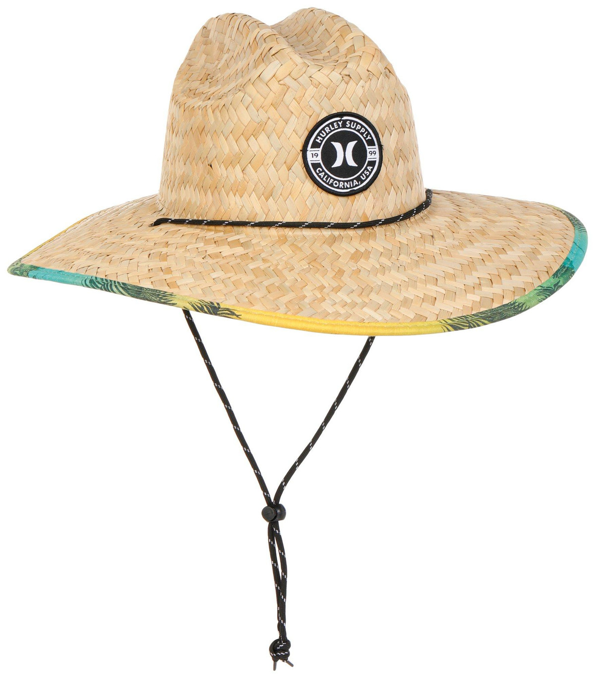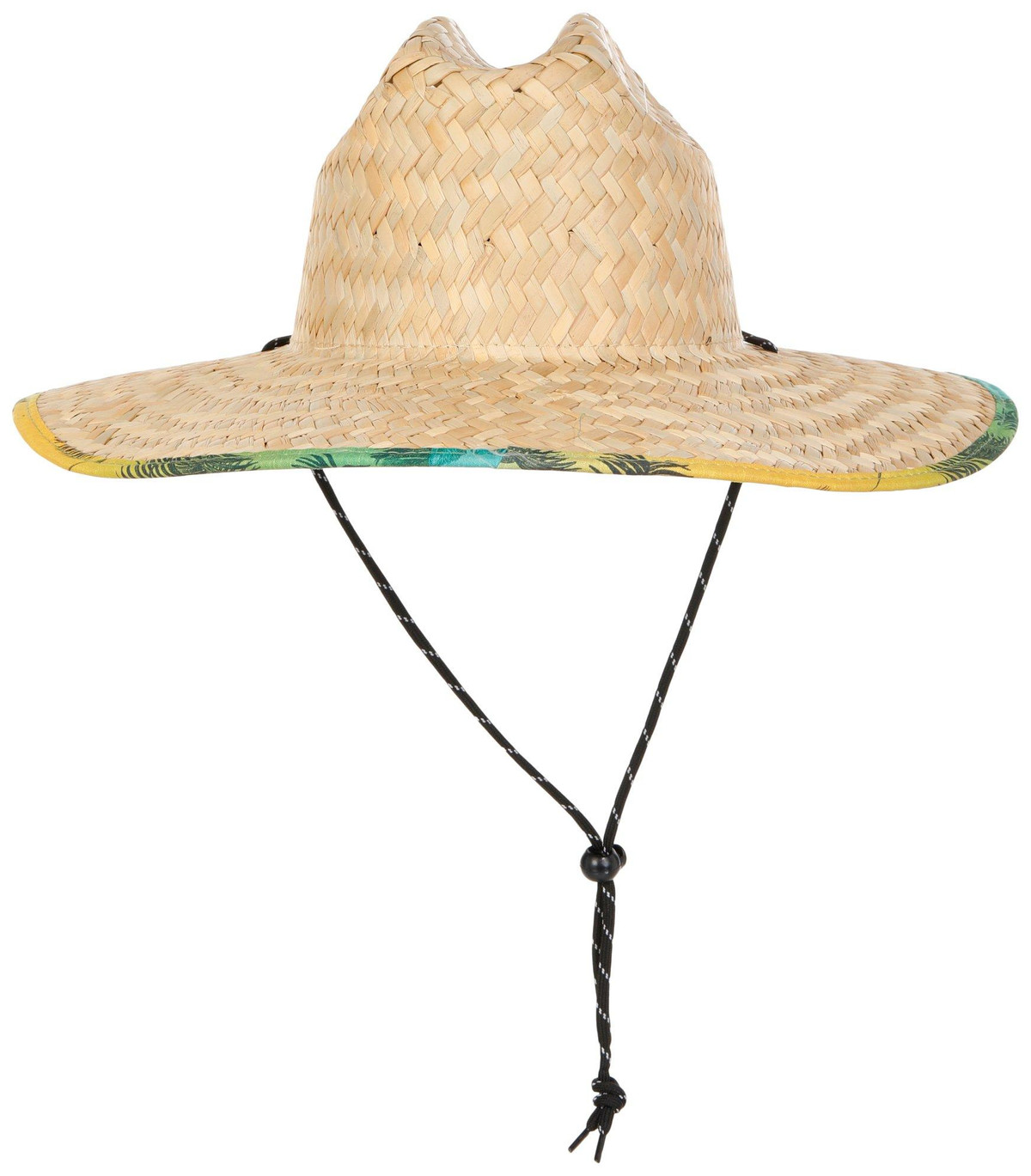 This Shoreline Straw Lifeguard Hat features a 100% straw woven construction, a front logo patch, a pinched crown, a wide brim, an interior stretch sweatband, and an adjustable chin strap. Brim measures approximately 4.5 in.