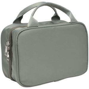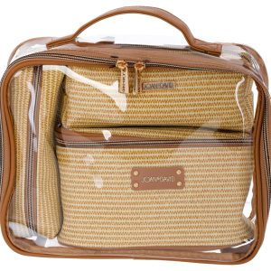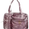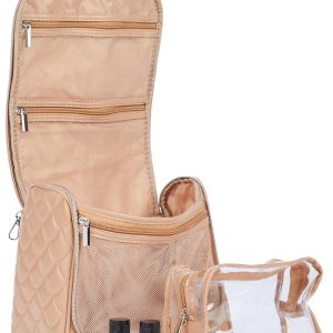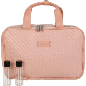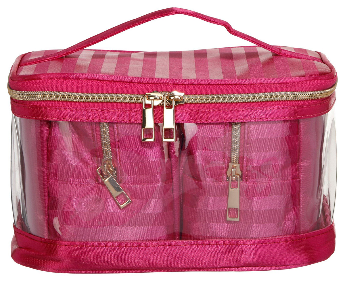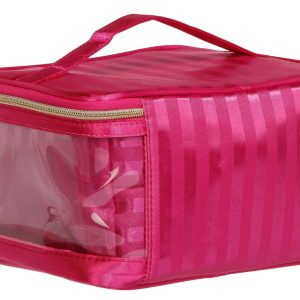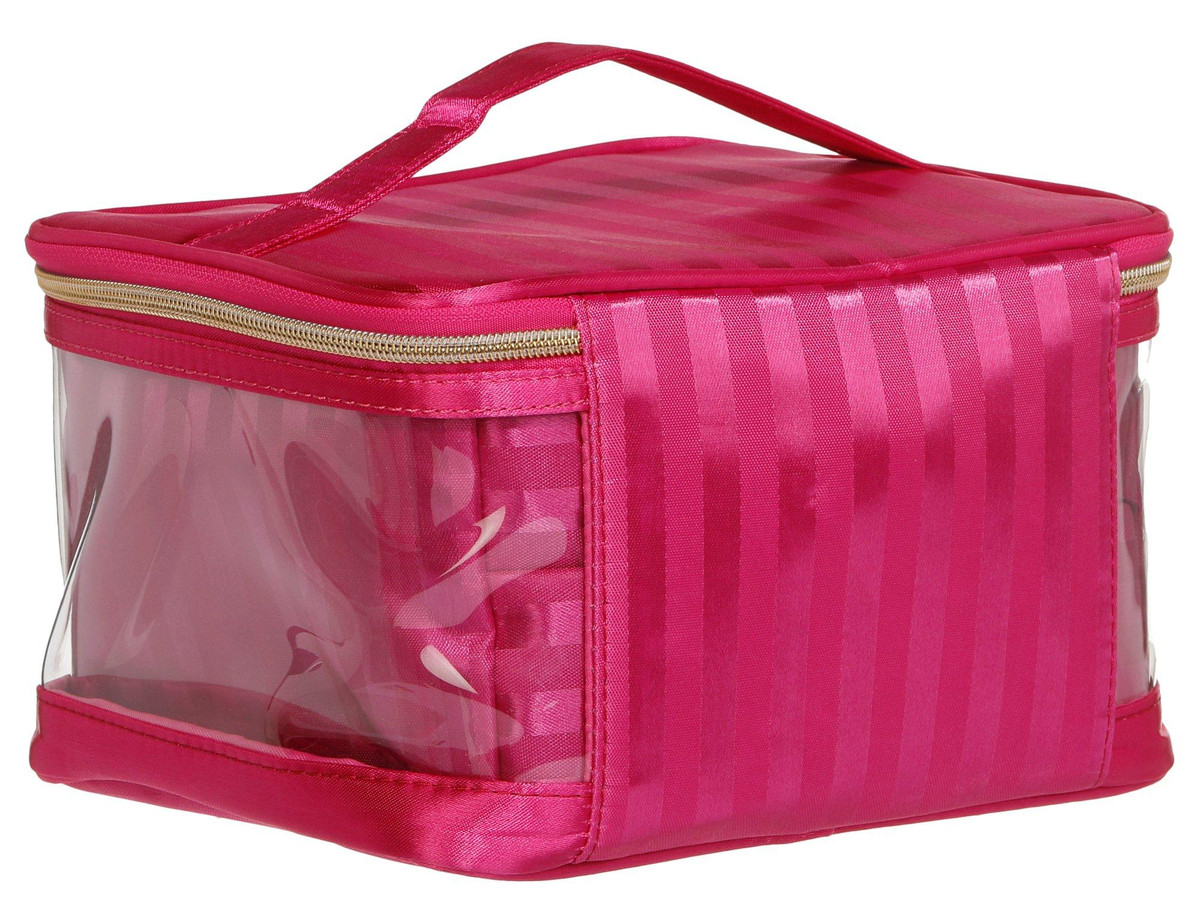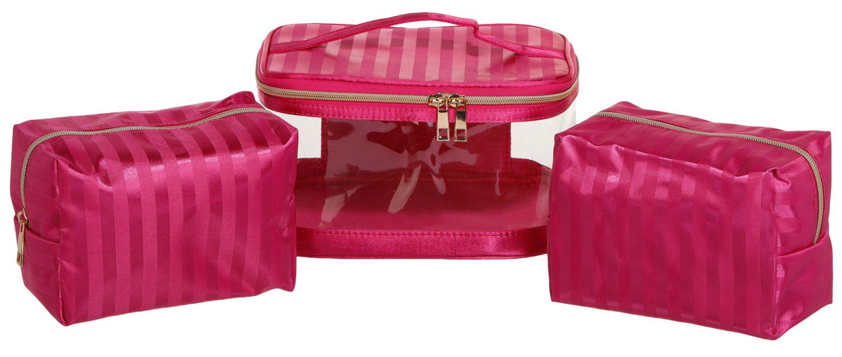 A set of three pink cosmetic bags. The set includes a larger, transparent-bottomed main bag and two smaller, rectangular side bags. They help in organizing cosmetics, preventing spills, and keeping items clean and accessible, ideal for traveling.