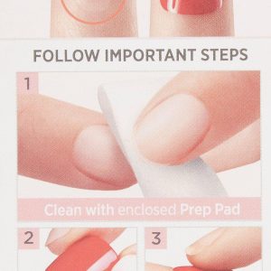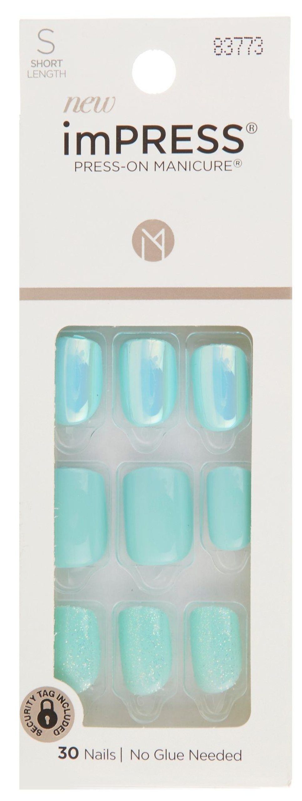 Includes a set of 30 pre-glued nails in solid, reflective, and sparkle designs. 12 months expiration from first use.