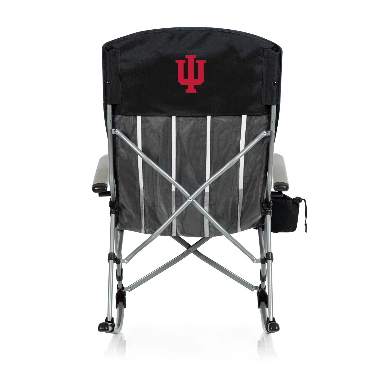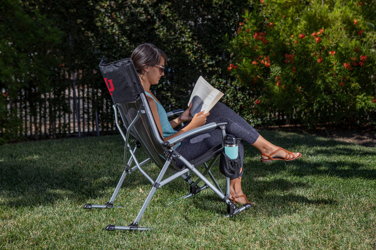 The INDIANA HOOSIERS Outdoor Rocking Chair is the a fan favorate at tailgates and backyard BBQs. Folding rocking chair with mesh cup holder in armrest; Includes carrying bag; Made of 600D PVC with steel frame; Includes: 1 Outdoor Rocking Chair, 1 Drawstring Carrying Bag with Shoulder Strap. Dimensions: 28 x 35.8 x 40.5. Weight limit 250 LBS.