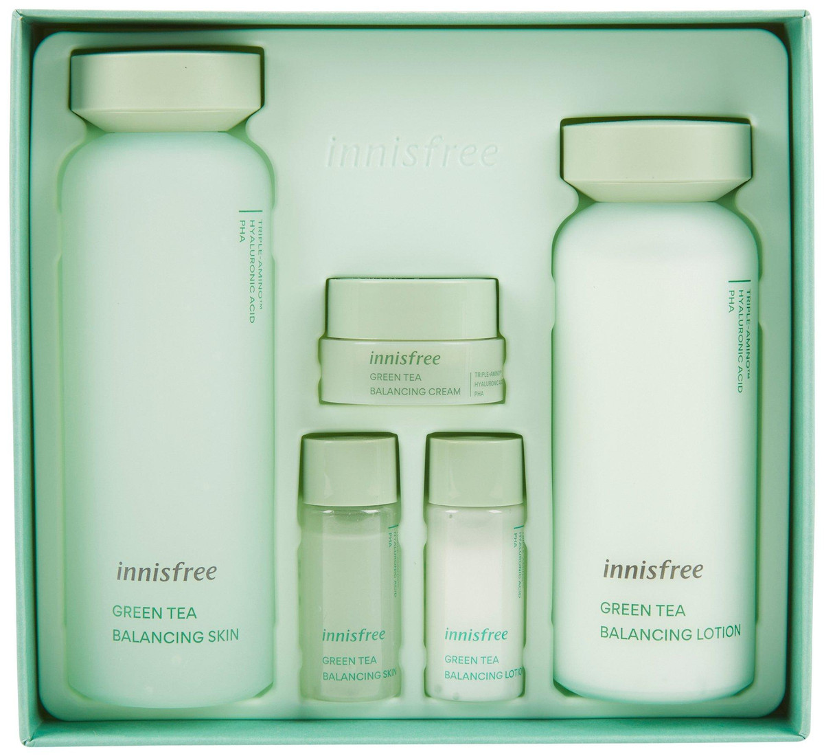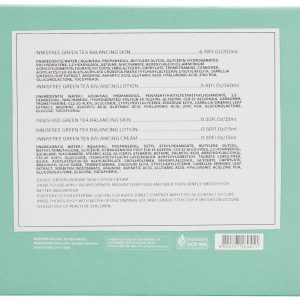 Support healthy, hydrated skin with the Innisfree 5 Pc Green Tea Balancing Skin Care Set. Enriched with green tea extract, hyaluronic acid, and PHA, the set works to balance moisture levels while gently refining skin texture. Each product helps maintain a soft, refreshed complexion with antioxidant protection. Suitable for daily use in morning and evening routines.