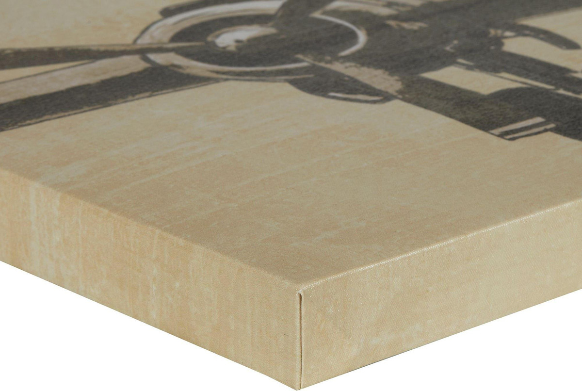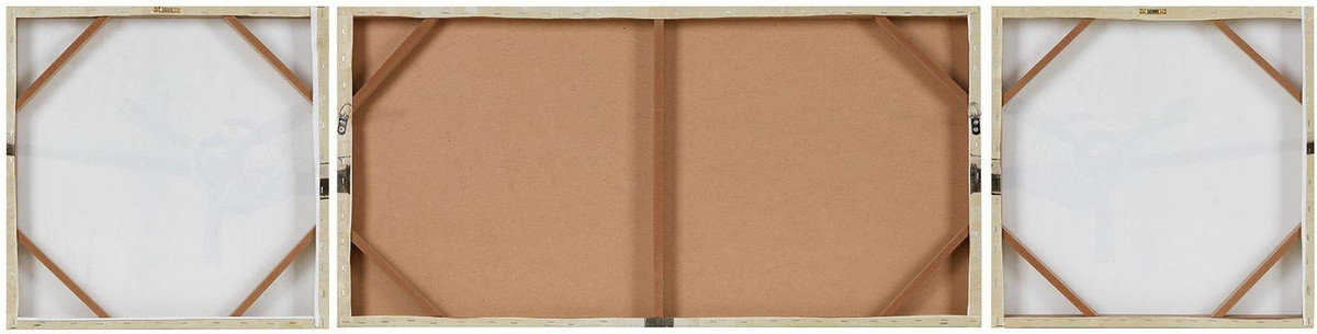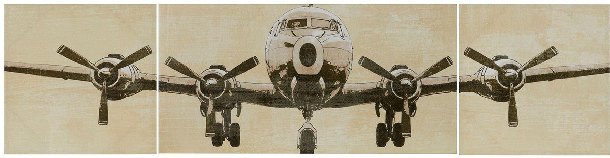 Create a soaring display with Flight Time three-piece canvas set. A large airplane spreads across three canvases in light and dark natural colors for a striking appearance. The gel coat gives these canvas art works a glossy finish that adds dimension to each piece. Hang Flight Time in an office or studio for a bold look that encompasses an adventurous and determined spirit. Center canvas measures 40”L x 20”W x 1.5”H and end canvases measure 20”L x 20”W x 1.5”H.