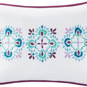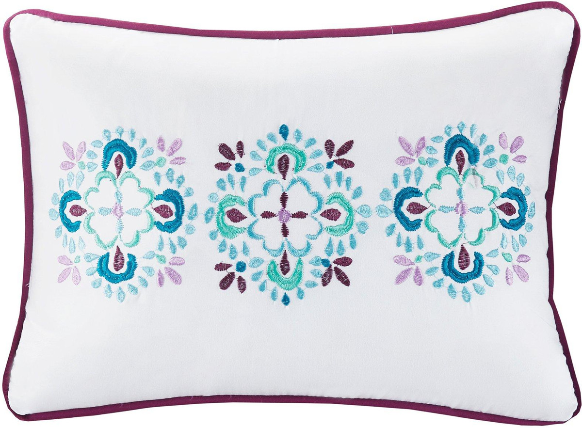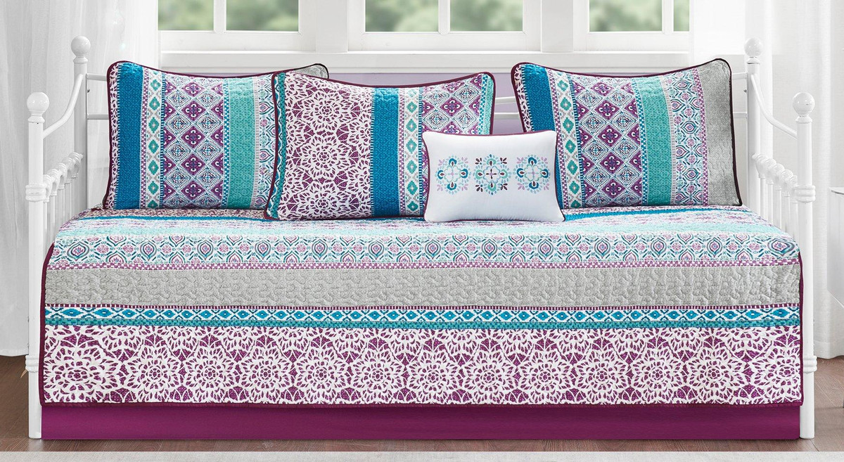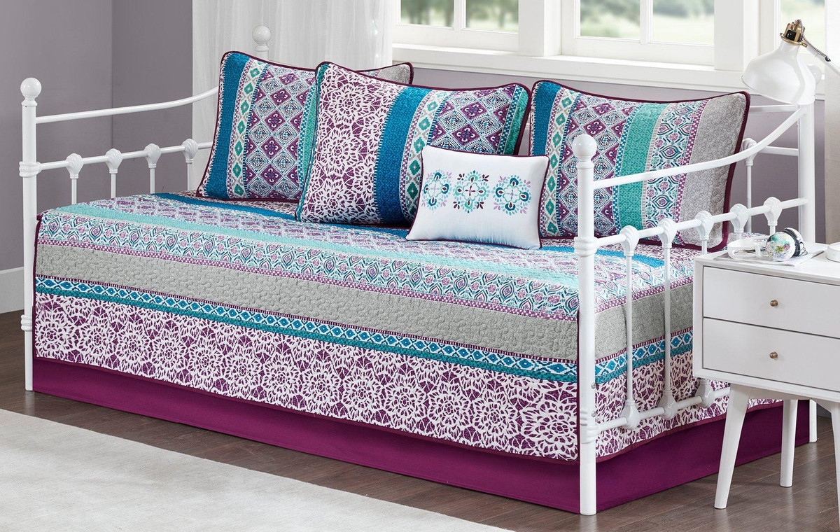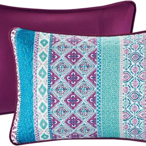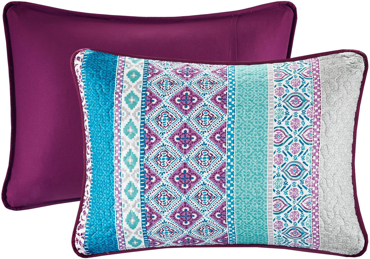 The Intelligent Design Joni 6 Piece Boho Reversible Daybed Set brings refreshing splash of color and style to your bedroom. This quilted daybed cover flaunts a beautiful boho pattern in deep purples and vibrant blues with a solid purple reverse, for a stunning shabby chic look. Three shams feature coordinating boho designs and solid purple reverse. Embroidered decorative pillow is included and measures 12 x 16.