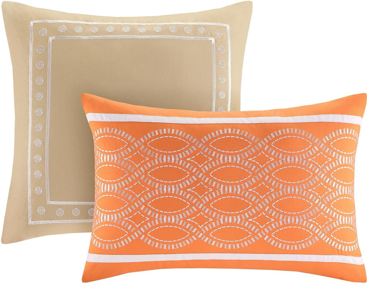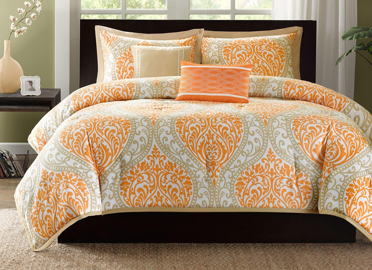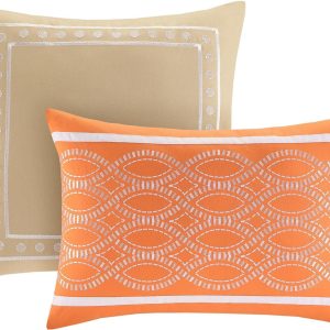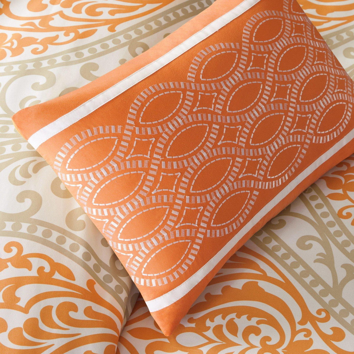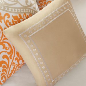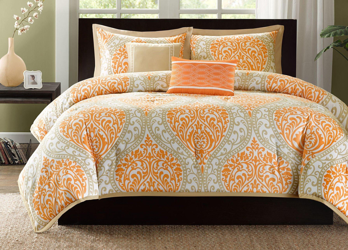 The vibrant Intelligent Design Senna Orange Comforter Set’s damask print adds a pop of color to any bedroom. Set includes one comforter, two shams (one for twin size), and two embroidered decorative pillows. Pillows measure 12”L x 18”W and 16”L x 16”W. Available in multiple sizes.