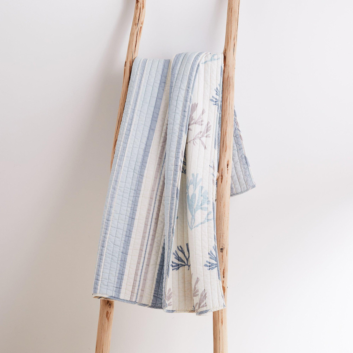The Ipanema Reversible Quilted Throw by Levtex Home is inspired by a charming beachfront cottage. This striped coastal design will immediately transform your bedroom. Made with the softest lightweight cotton, this reversible throw features a printed textured stripe in shades of blue and taupe, reversing to a taupe and blue coral on the other. The Quilted Throw is perfectly sized at 50x60in. and is machine washable. Enjoy for years to come!