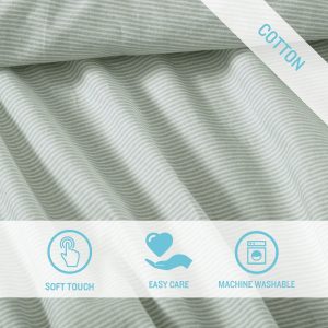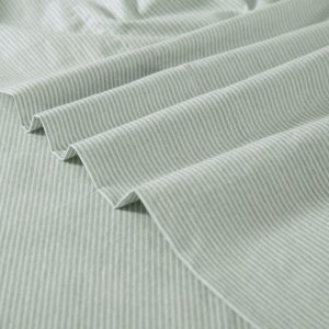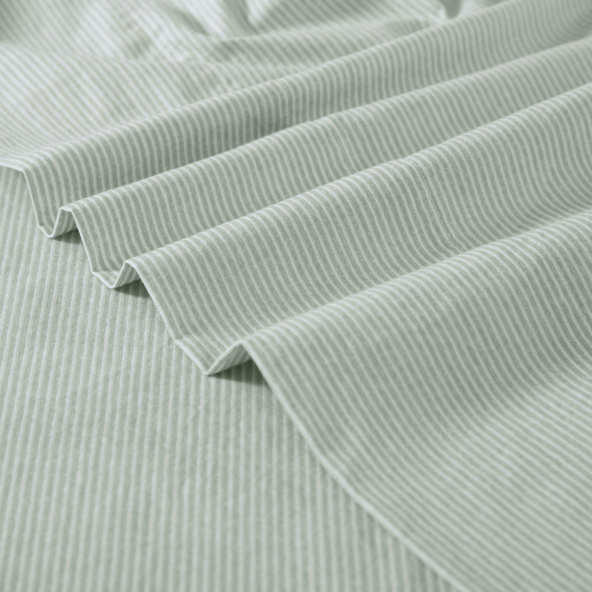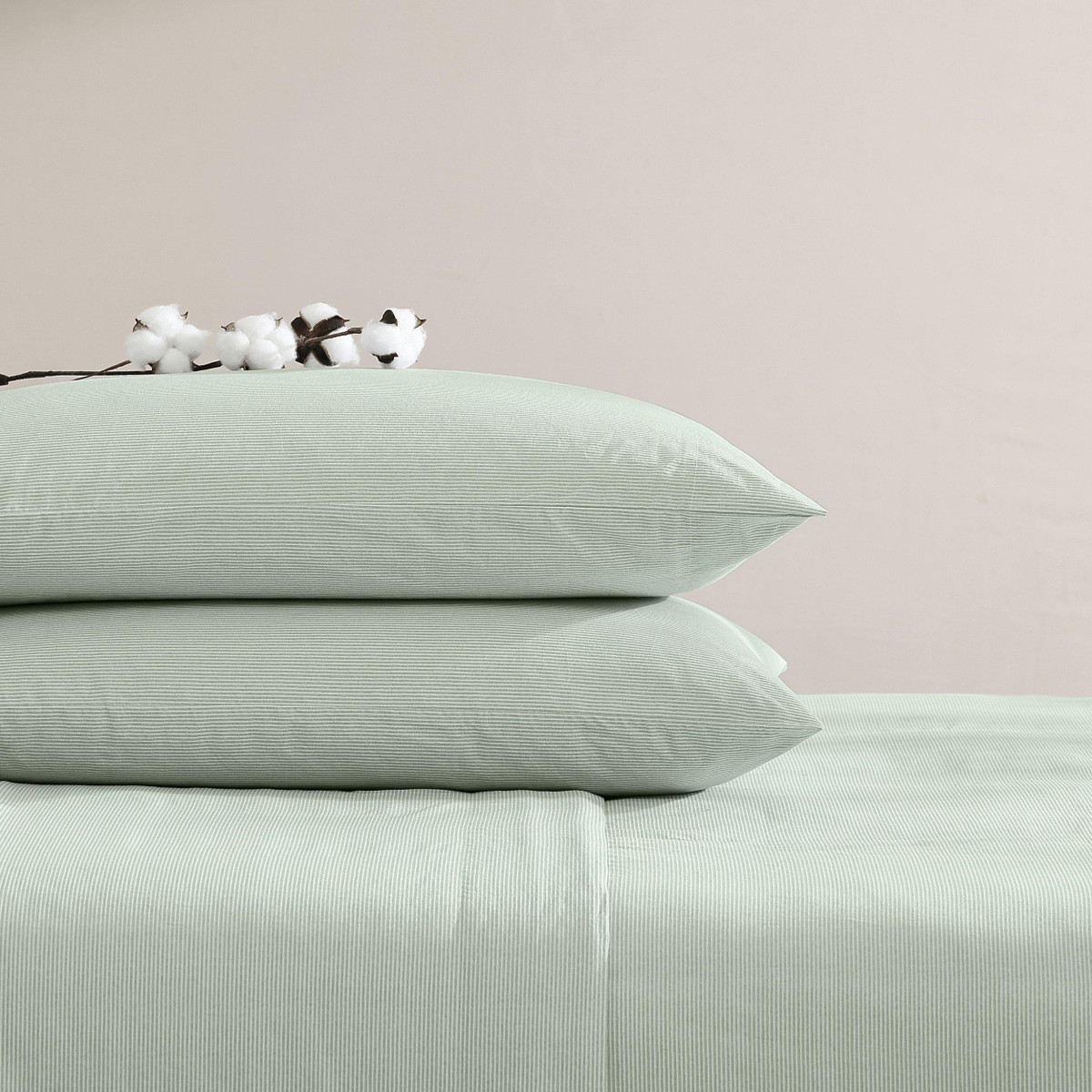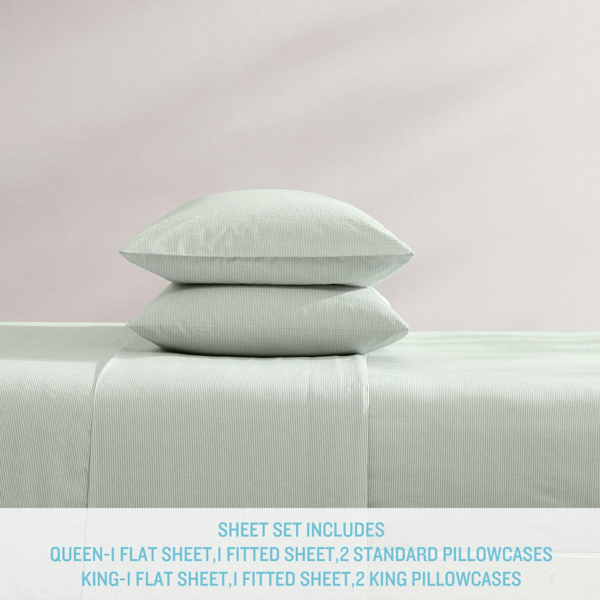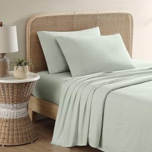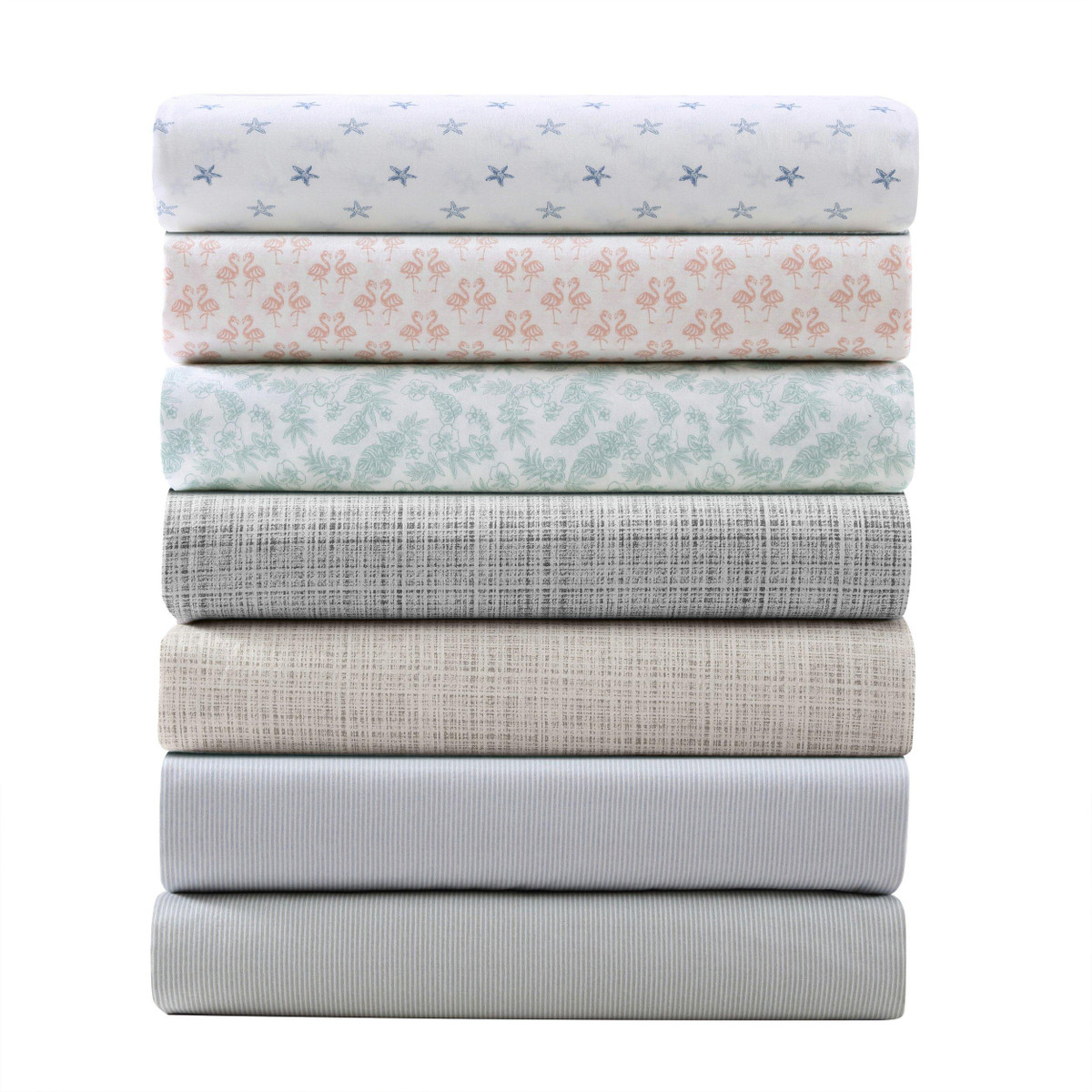 Add beautiful coastal inspired print to your bedroom with the Island Cays Stripe sheet set from Tommy Bahama. Featuring a simple pinstripe design, these sheet sets are great for layering with your favorite bedding. Providing quality cotton construction, they are crisp and breathable, perfect for a great night’s sleep. The included fitted sheet features a deep pocket and fits mattresses up to 18 in. deep. Sheets and pillowcases are machine washable for easy and convenient care.
