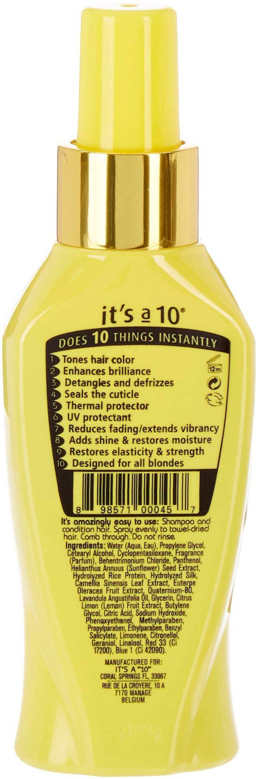 This It’s A 10 Spray is design specially for blonde hair. Does 10 things instantly – tones hair colors, seals cuticle, protects against heat, adds shine, and more! 4 fl oz