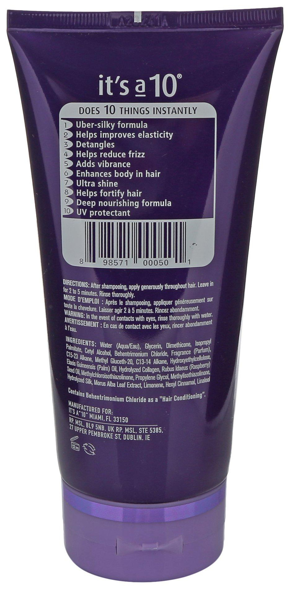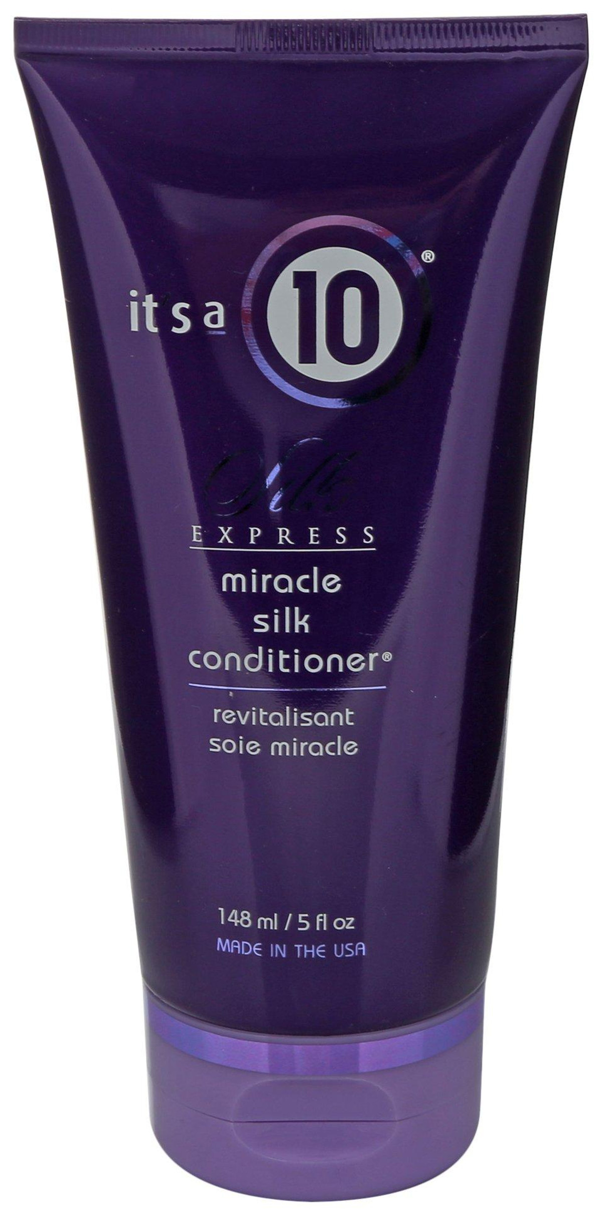 It’s a 10 Silk Express Miracle Silk Conditioner cuts drying time, strengthens hair, improves elasticity, adds vibrancy, enhances body, and prolongs color. Leave in for 2 to 5 minutes. Best if used within 12 months of opening. Contains 5 fl. oz.
