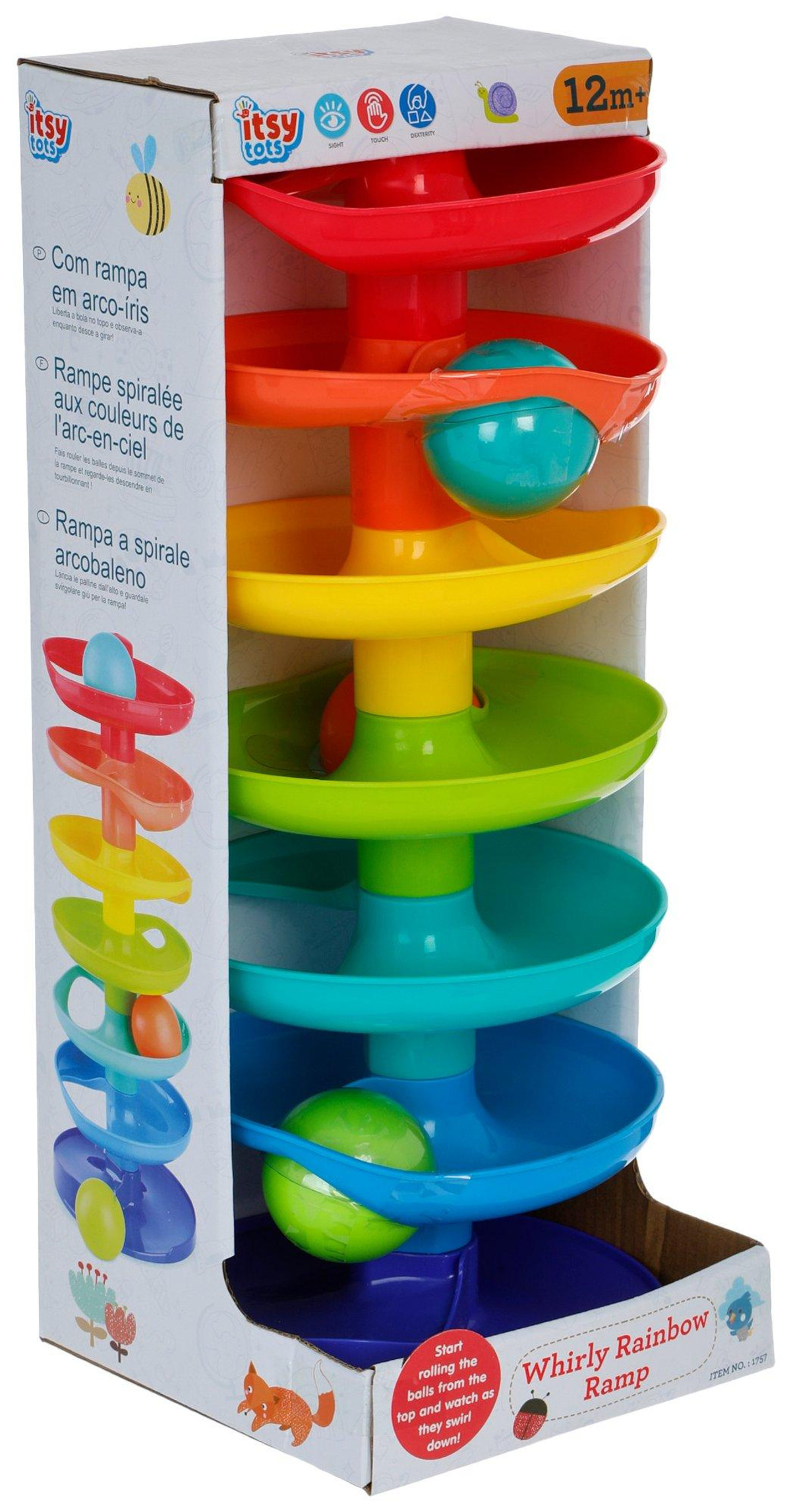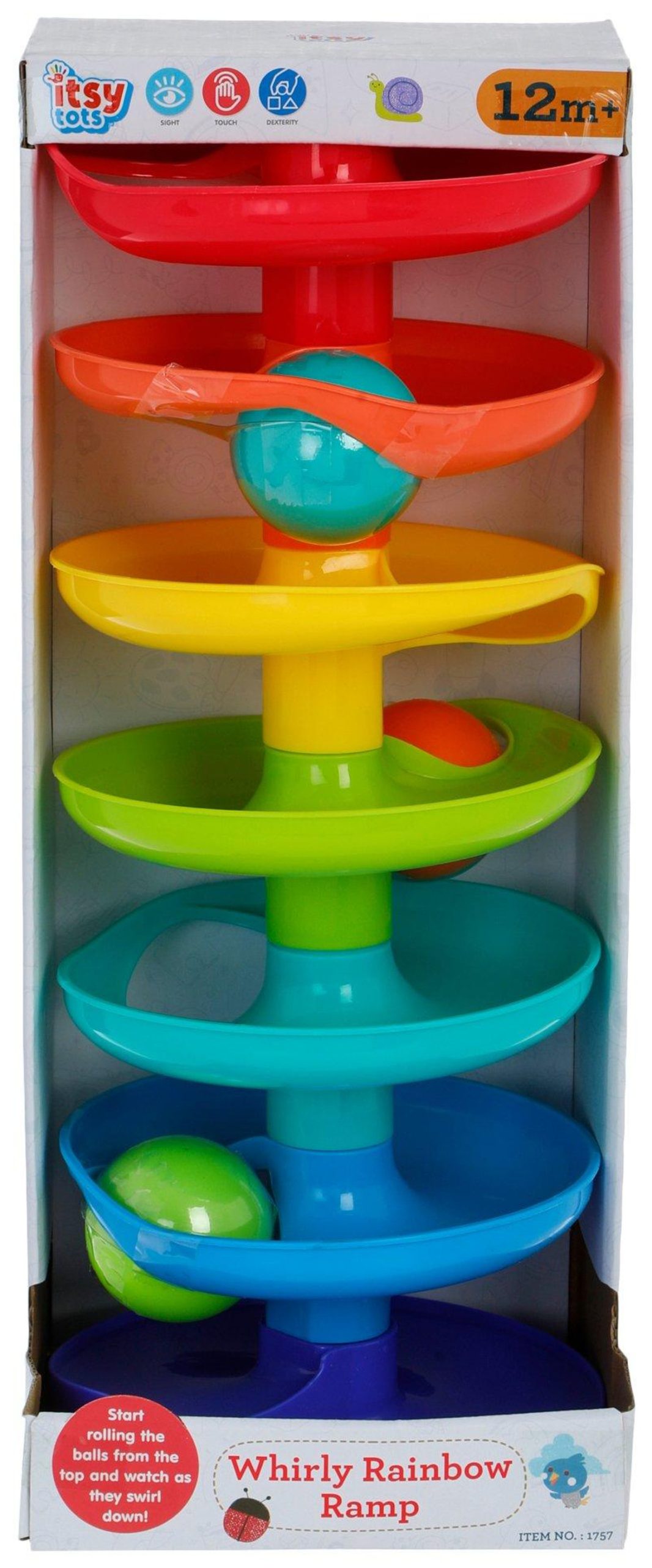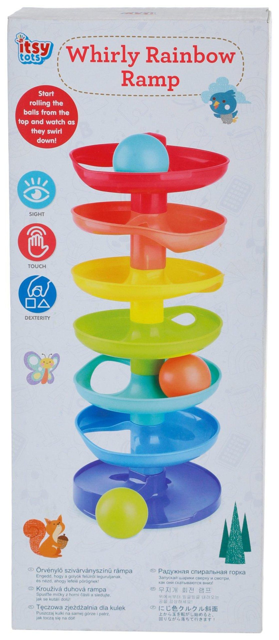 Stimulate sensory development and improve fine motor skills with this Playgo Whirly Rainbow Ramp. with seven distinct levels for the balls to go, your child can learn while having loads of fun watching the balls drop down on the rainbow ramp. 14 inch height.