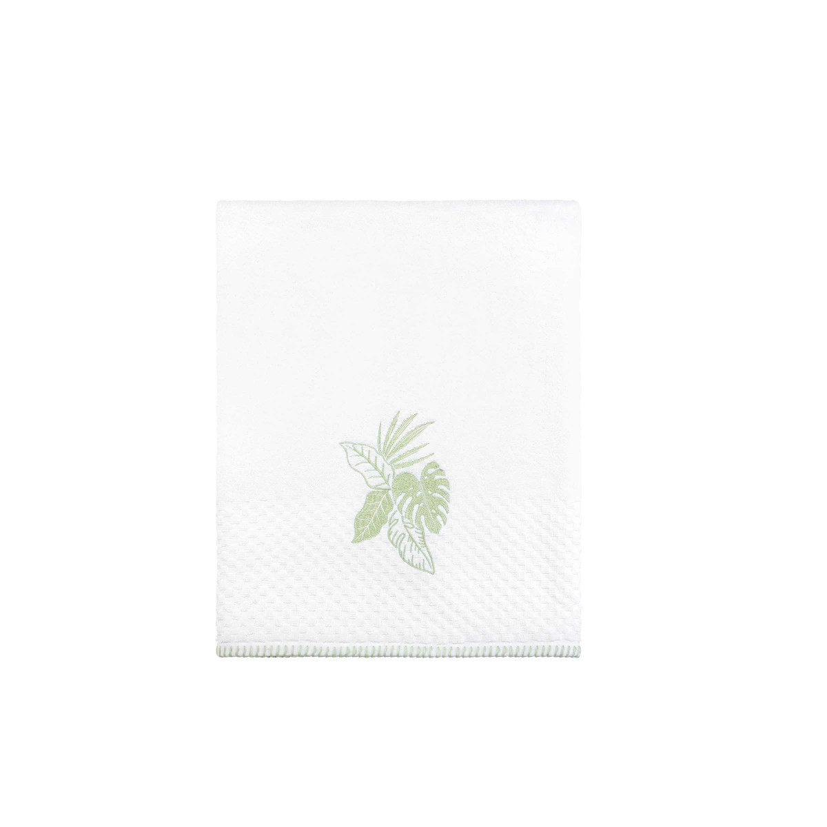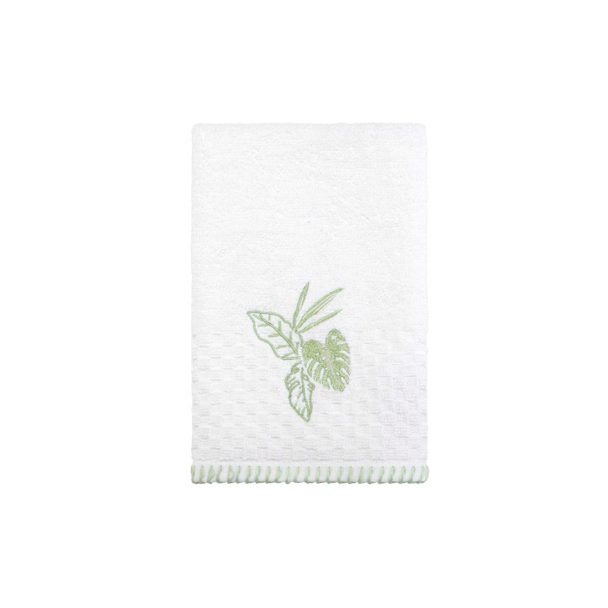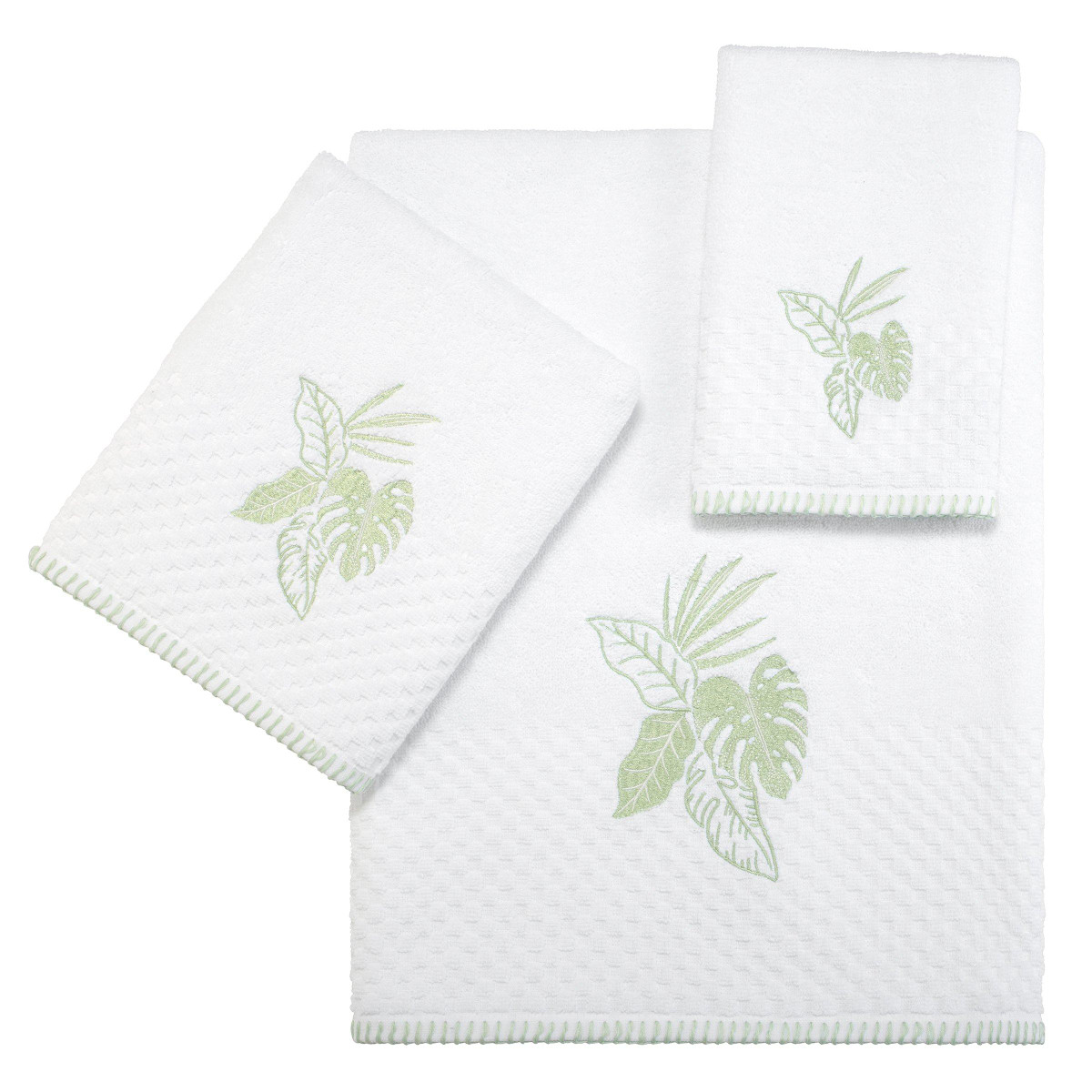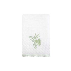 Refresh your bathroom with the Izod Reef 3 Pc. Towel Collection. It features a large tropical leaf motif in green on a white background. These 100% cotton textured terry towels are finished with a coordinating green whipstitched border. The bath towel measures 27 in. x 52 in. The hand towel measures 16 in. x 28 in. The fingertip towel measures 11 in. x 18 in.