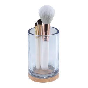 Refresh your bathroom décor with the Izod Cove Blue Glass Decorative Tumbler. It features a nicely weighted blue glass round body with a natural color wood base. It adds an updated look to any bathroom, bedroom or office. Measures 2.76 in. x 2.76 in. x 4.41 in. Other matching pieces available.