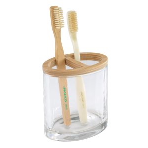 Refresh your bathroom décor with the Izod Cove Clear Glass Decorative Toothbrush Holder. It features a nicely weighted clear glass oval body with a natural color wood divider. It adds an updated look to any bathroom, bedroom or office. Measures 4.25 in. x 2.99 in. x 4.33 in. Other matching pieces available.