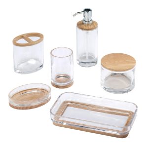 Refresh your bathroom décor with the Izod Cove Clear Glass Decorative Tumbler. It features a nicely weighted clear glass round body with a natural color wood base. It adds an updated look to any bathroom, bedroom or office. Measures 2.76 in. x 2.76 in. x 4.41 in. Other matching pieces available.