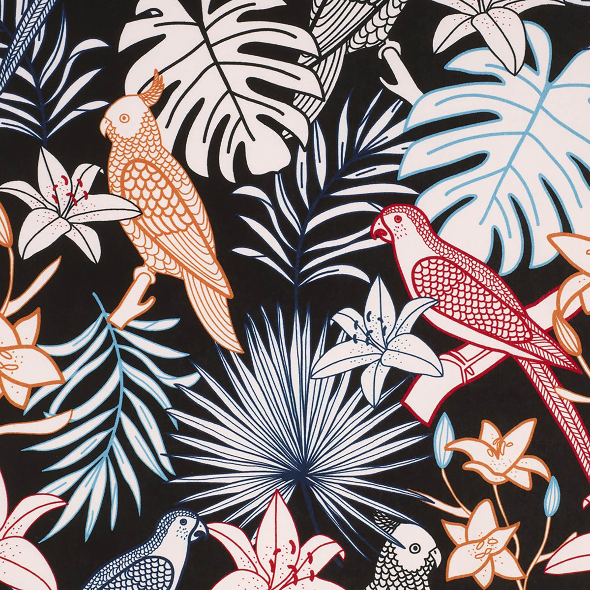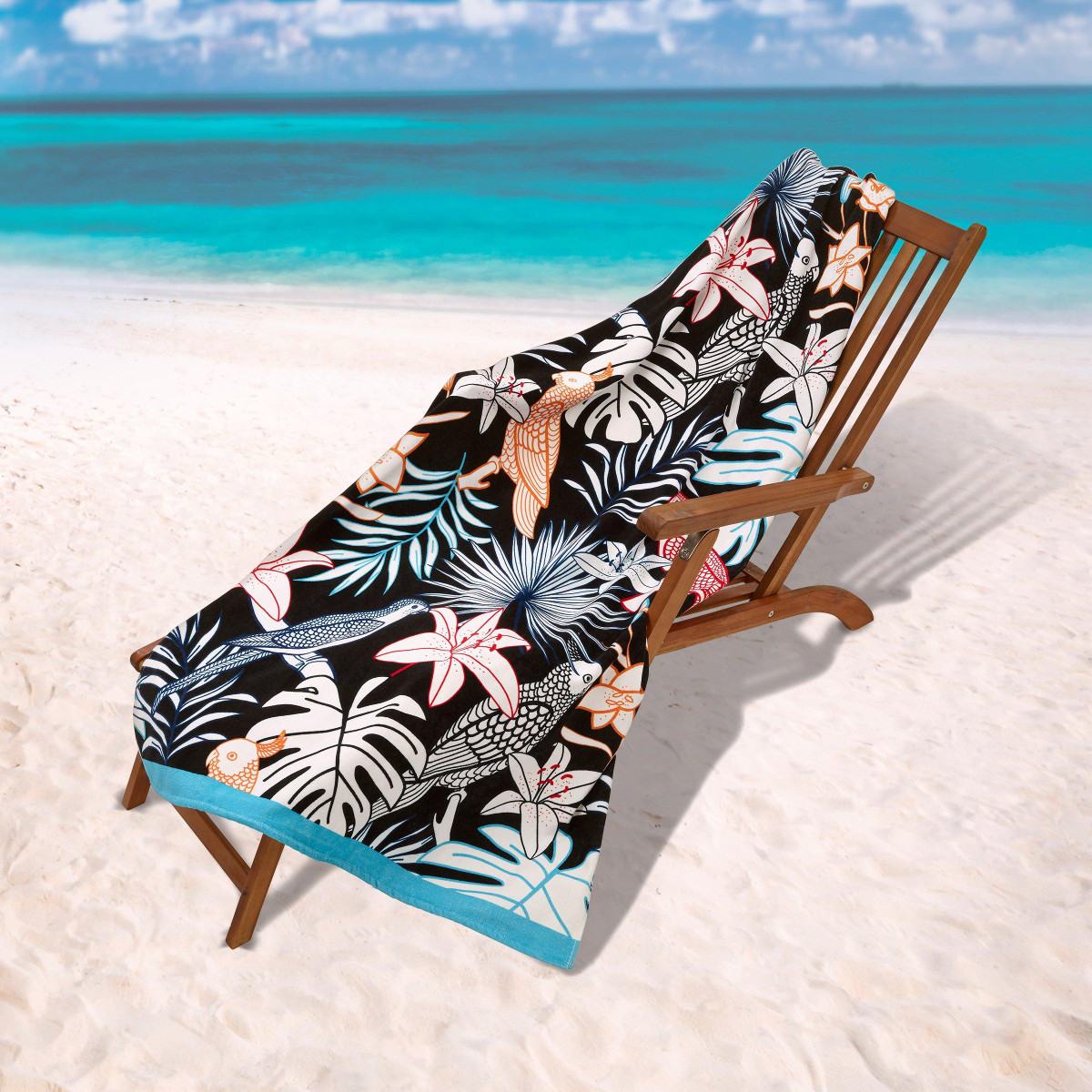 The Izod Paradise Bird Beach Towel features colorful tropical birds, flowers and leaves on a navy blue background with aquamarine borders on the top and bottom. The perfect addition to any day at the beach or pool. Printed on 100% cotton sheared velour with a terry back. Measures 40 in. x 70 in.