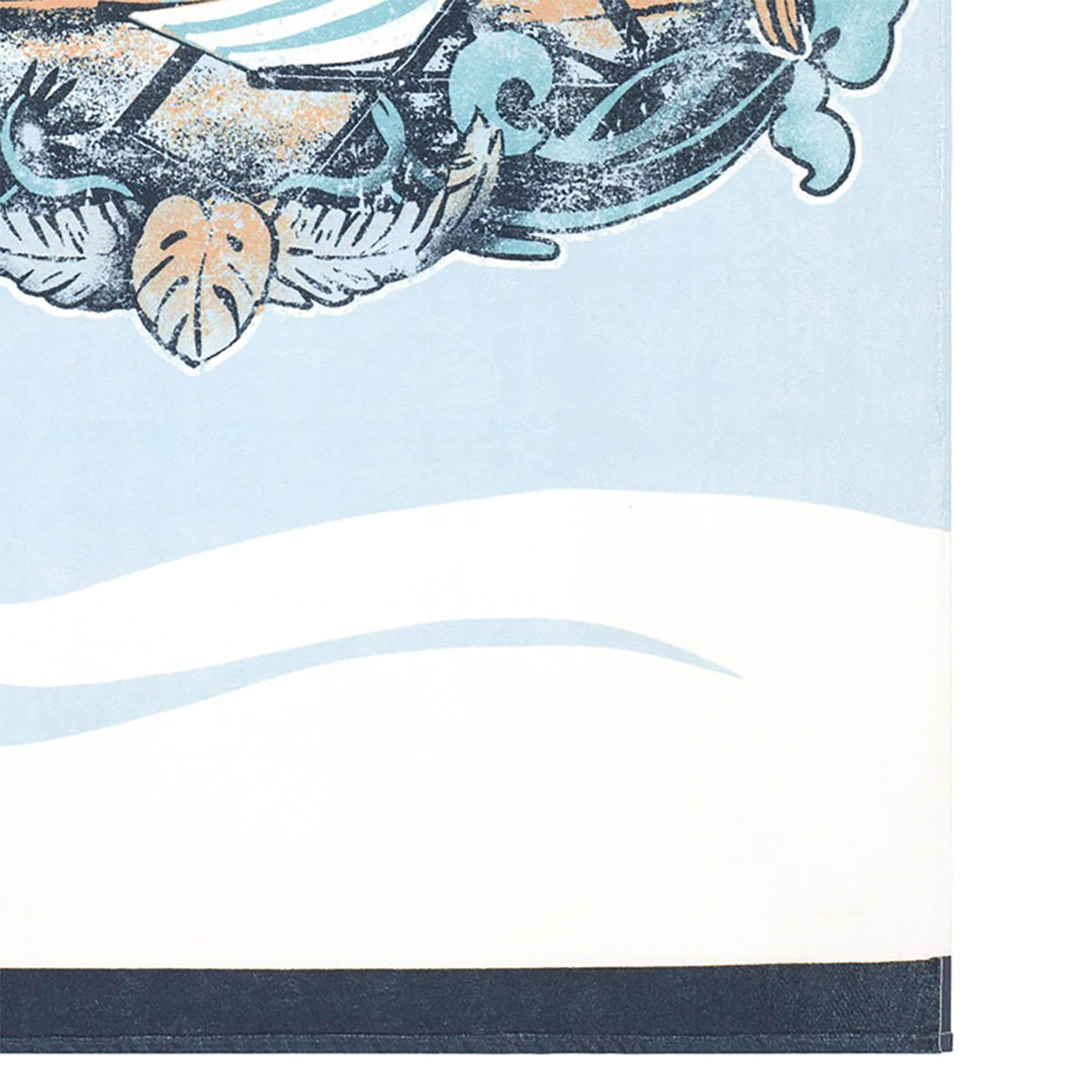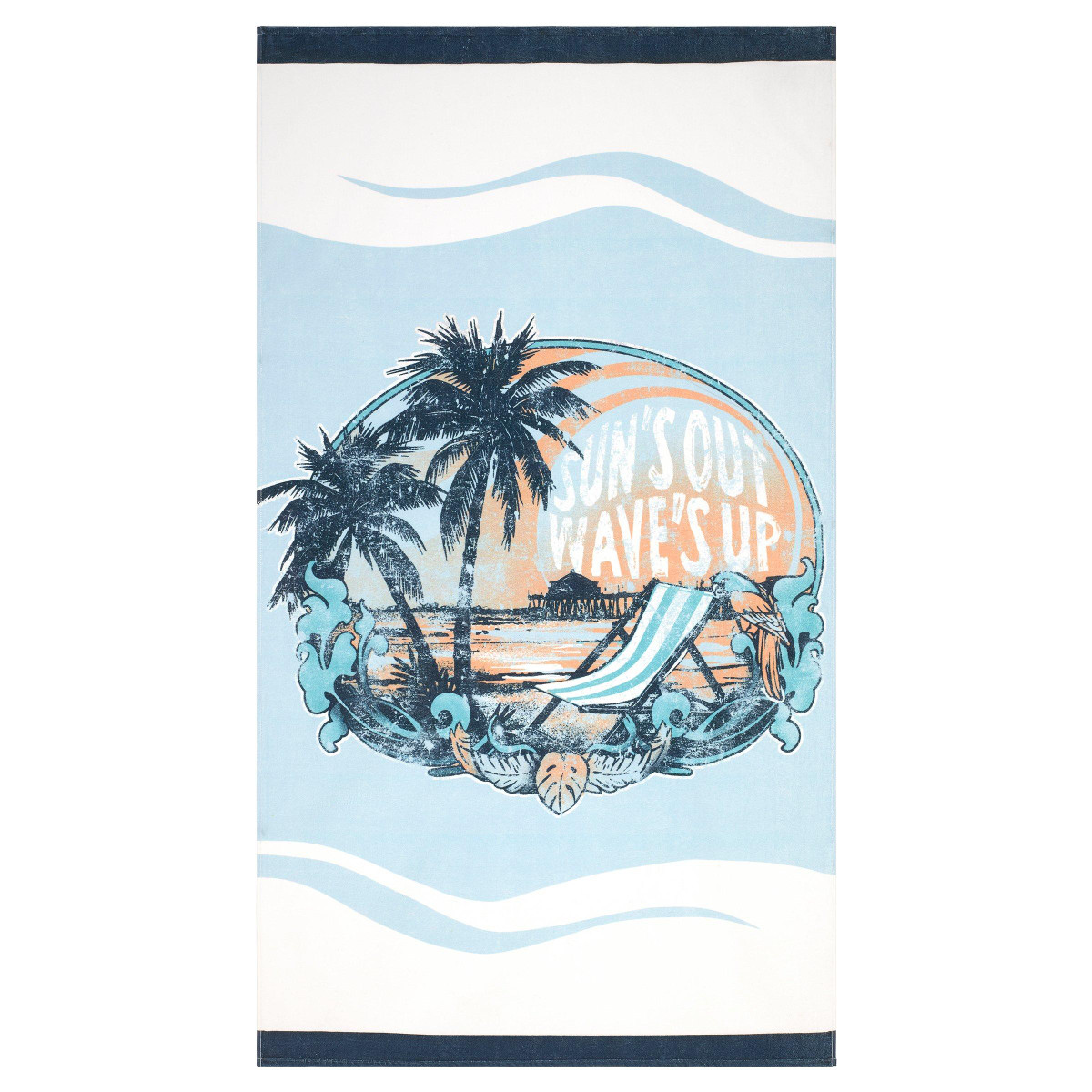 The Izod Sun Is Out Beach Towel features a tropical beach scene with palm trees, beach chair and Sun’s Out Wave’s Up on a sky blue and white ground. The towel is framed top and bottom with a navy blue border. Printed on 100% cotton sheared velour with a terry back. Measures 40 in. x 70 in.