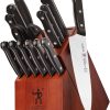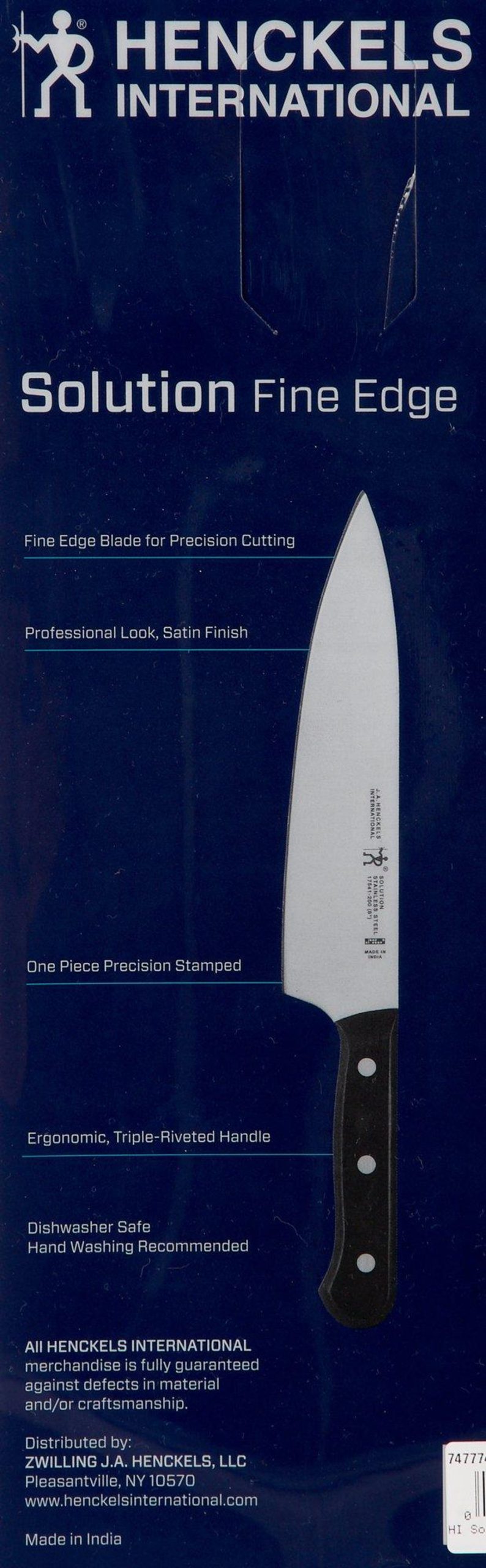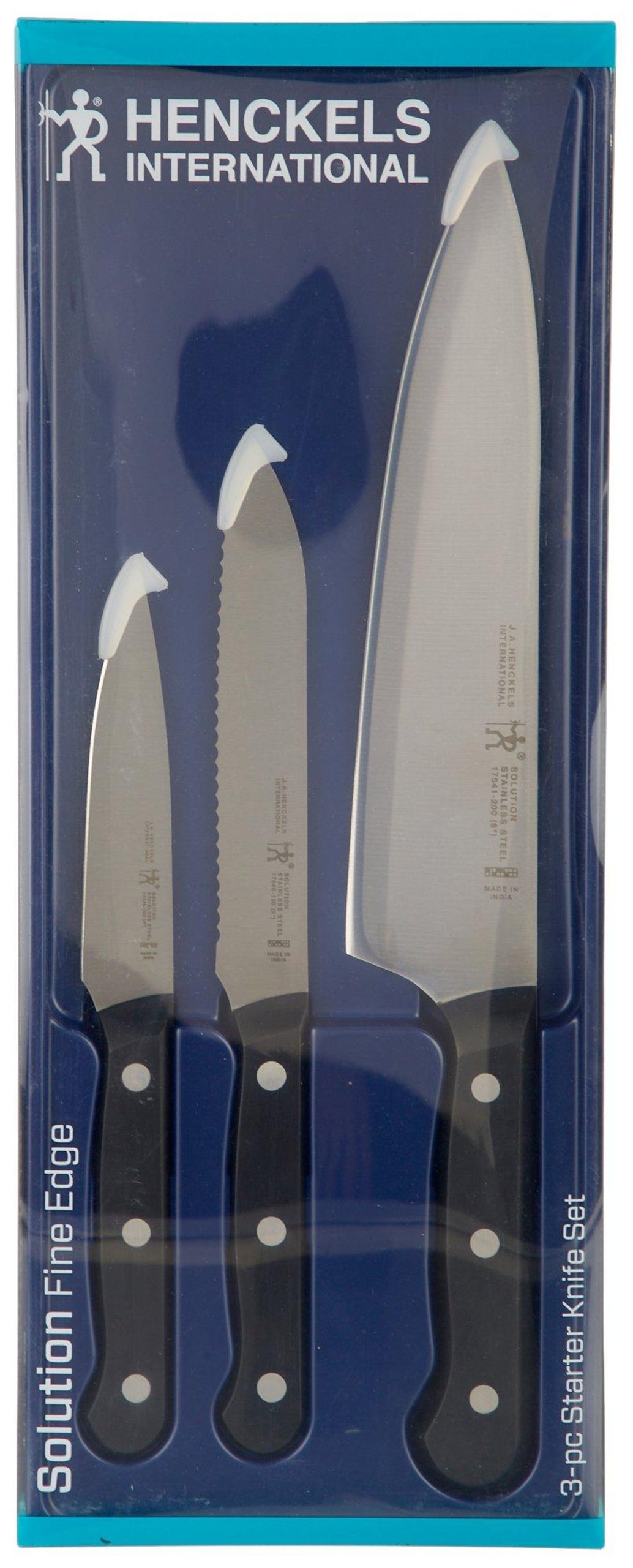 J.A. Henckels offers confidence with each cut. This 3-pc. knife set features a satin-finish stainless steel blade with fine edge for precision cutting, stamped full tang construction, finely honed for long-lastng sharpness, and ergonomic triple riveted handles. Set includes 8” chef’s knife, 5” serrated utility knife, and 3” paring knife.