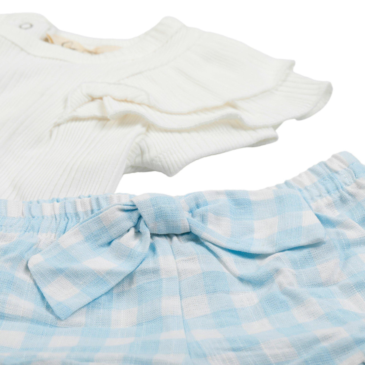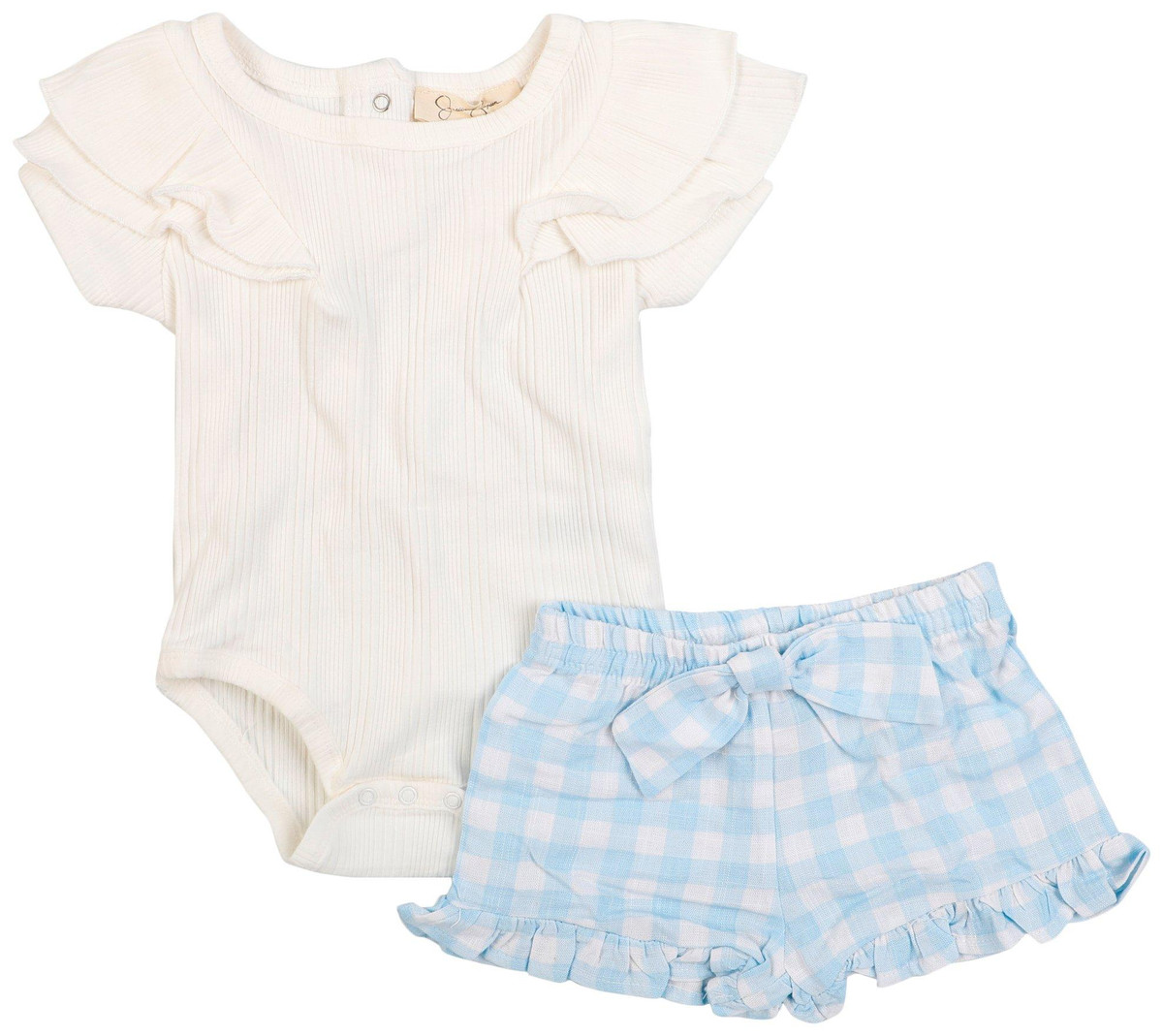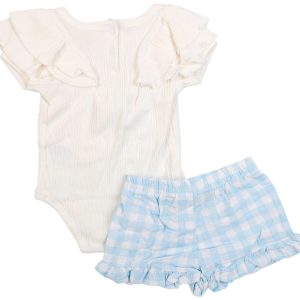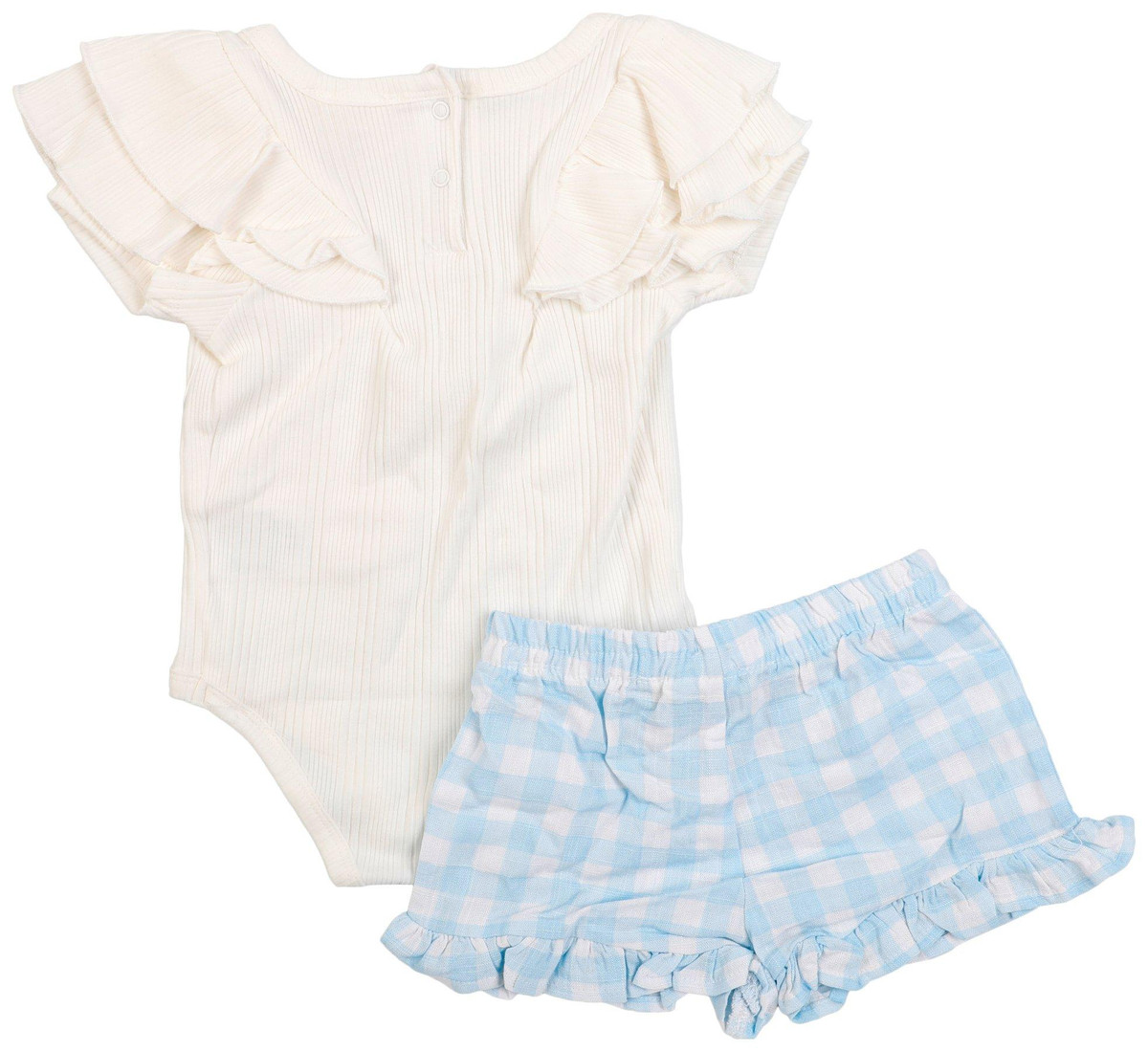 Wrap your little one in sweet charm with this 2-piece Baby Romper and Shorts Set. Made from a soft cotton/spandex blend, the romper features a solid color, ruffled shoulders, back snaps and easy-snap bottom for quick diaper changes. The shorts feature a gingham pattern and a cute bow accros the front, which adds a touch of sunshine-ready style. Perfect for cozy comfort and picture-perfect days. Fabrication is 96% cotton, 4% spandex.