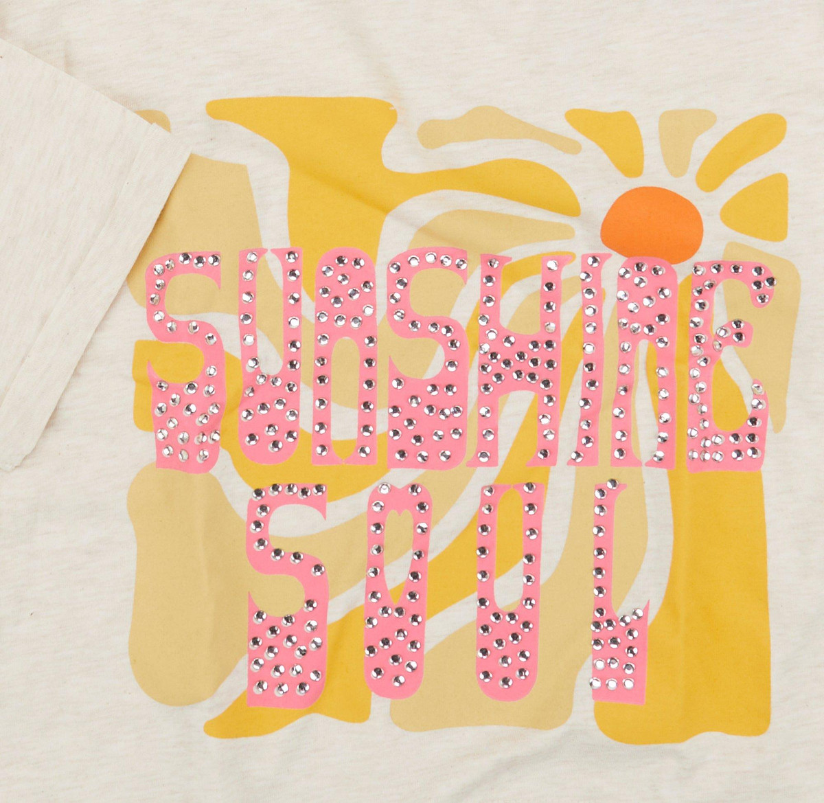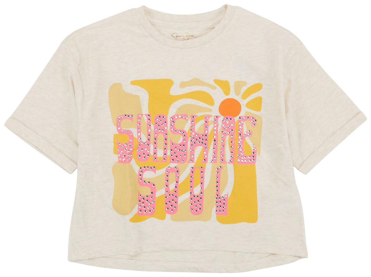 Introducing the Big Girls Sunshine Soul Top, crafted from a blend of polyester and cotton for a soft and comfortable feel. This stylish top features a Sunshine Soul script on the chest adorned with rhinestone embellishments, adding a touch of sparkle. The classic crew neckline and short sleeves complete the look, making it perfect for casual outings or special occasions.
