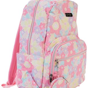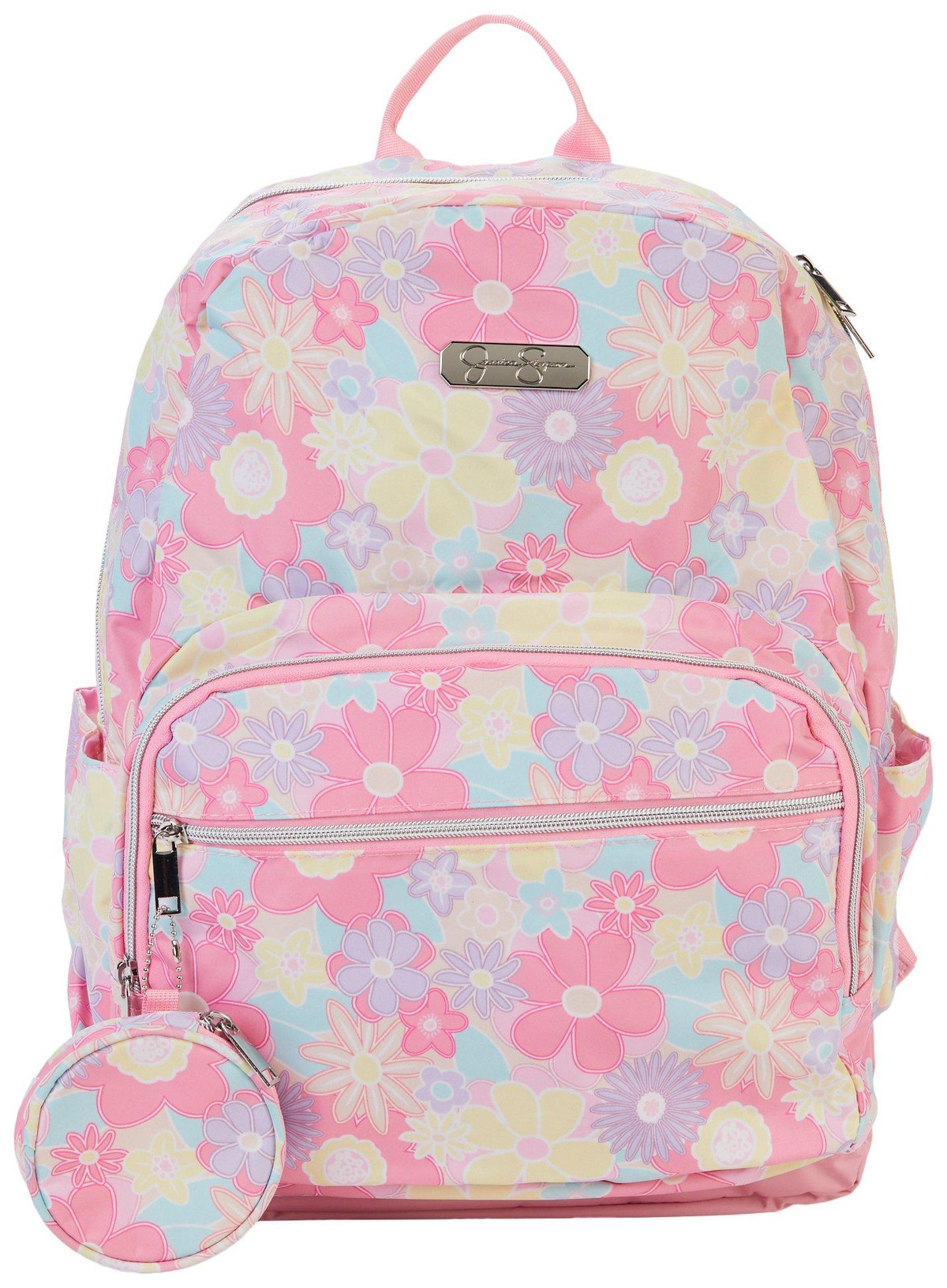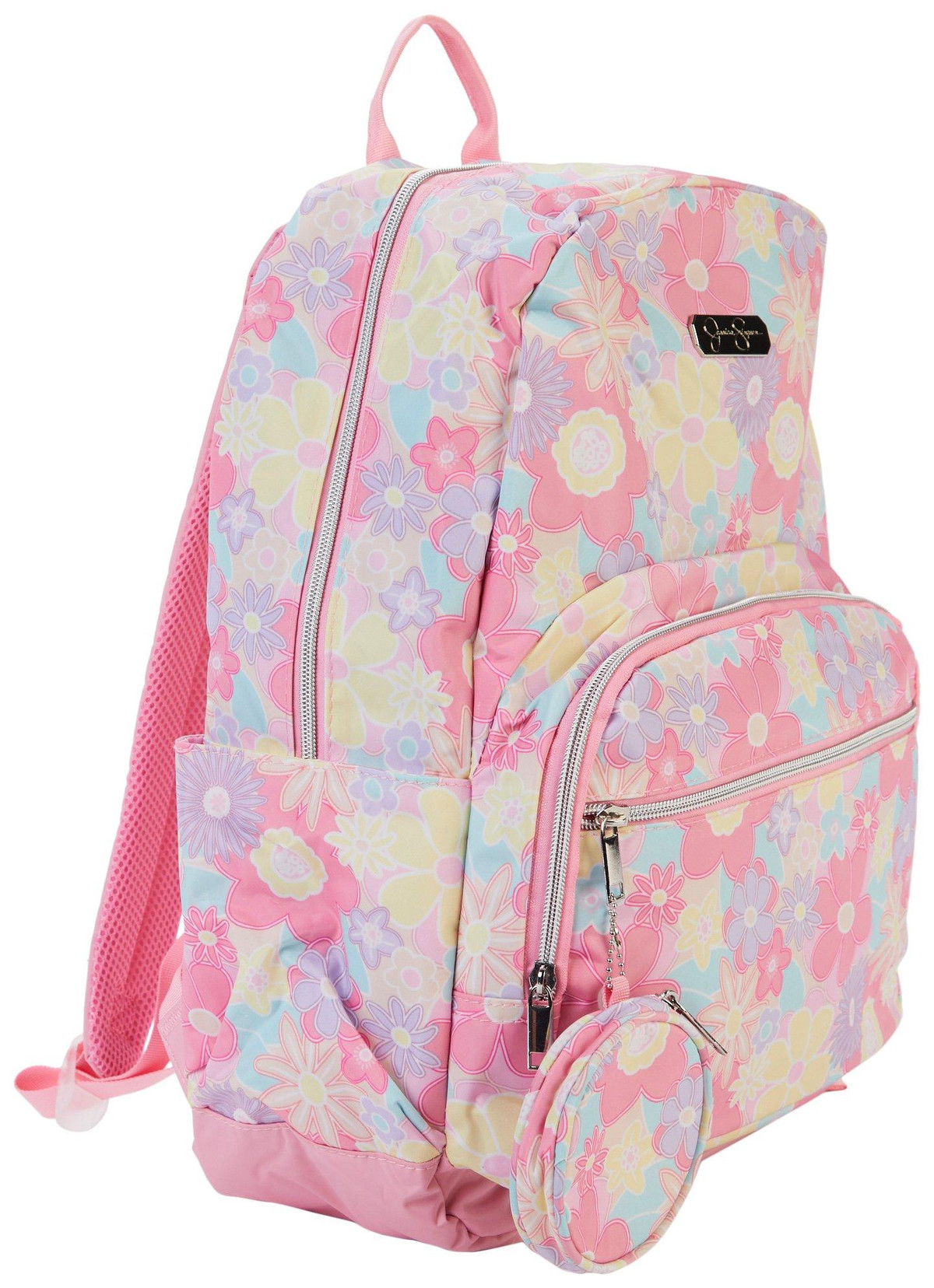 Enhance everyday style with the Jessica Simpson Pastel Flower Backpack. The pastel floral-patterned design comes with a detachable coin purse for added convenience and charm. Inside, a roomy main compartment and slip pockets offer practical organization. Adjustable padded straps ensure comfort for little shoulders. Ideal for school, outings or casual use. Spot clean as needed.