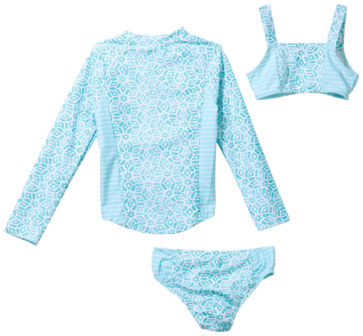 The Little Girls 3 Pc Print Swim Suit is a playful set perfect for sunny days. It features a fun all over print and includes a long sleeve rash guard for extra sun coverage, a cute bikini top, and matching briefs for a complete and colorful beach look.