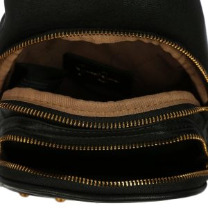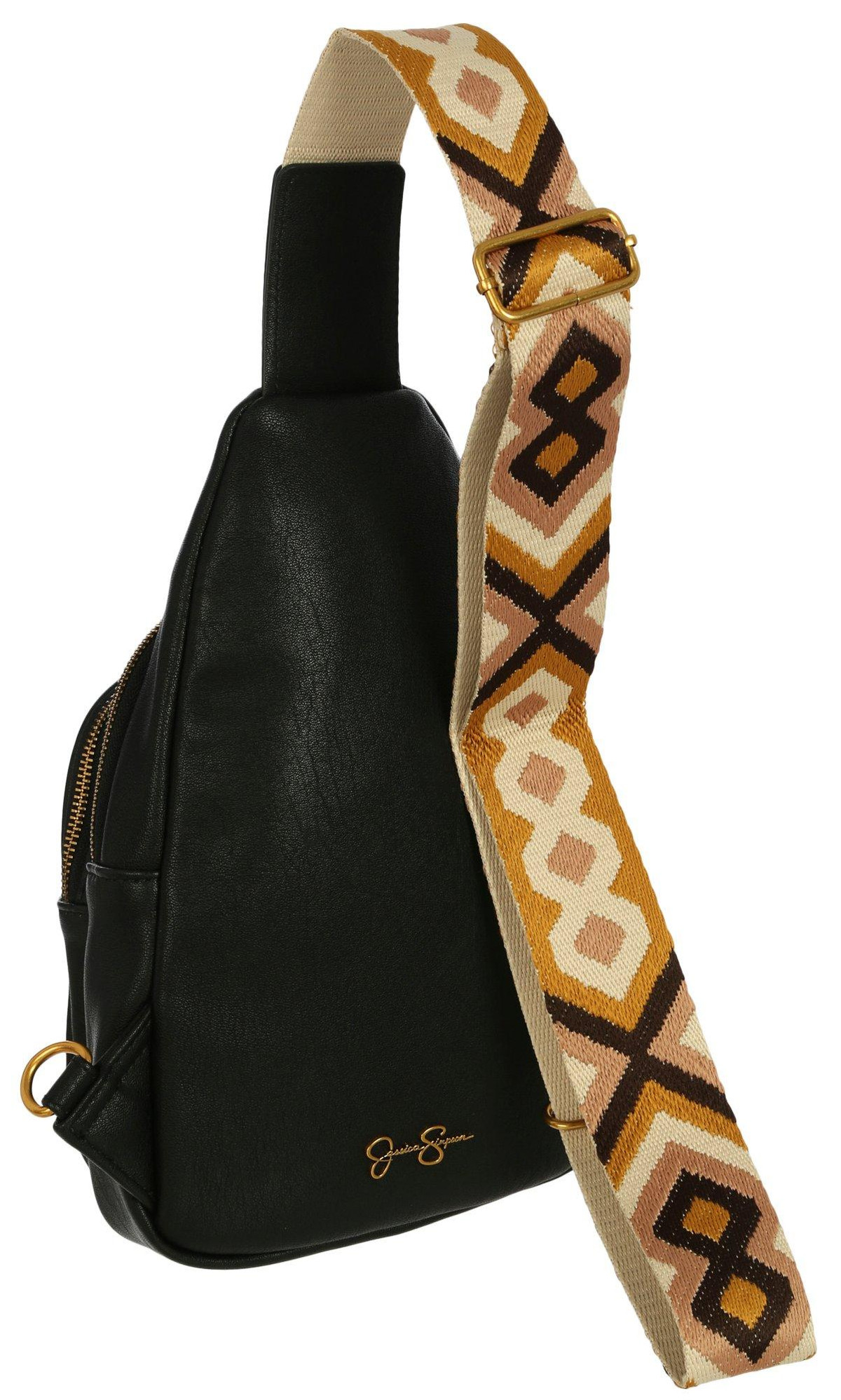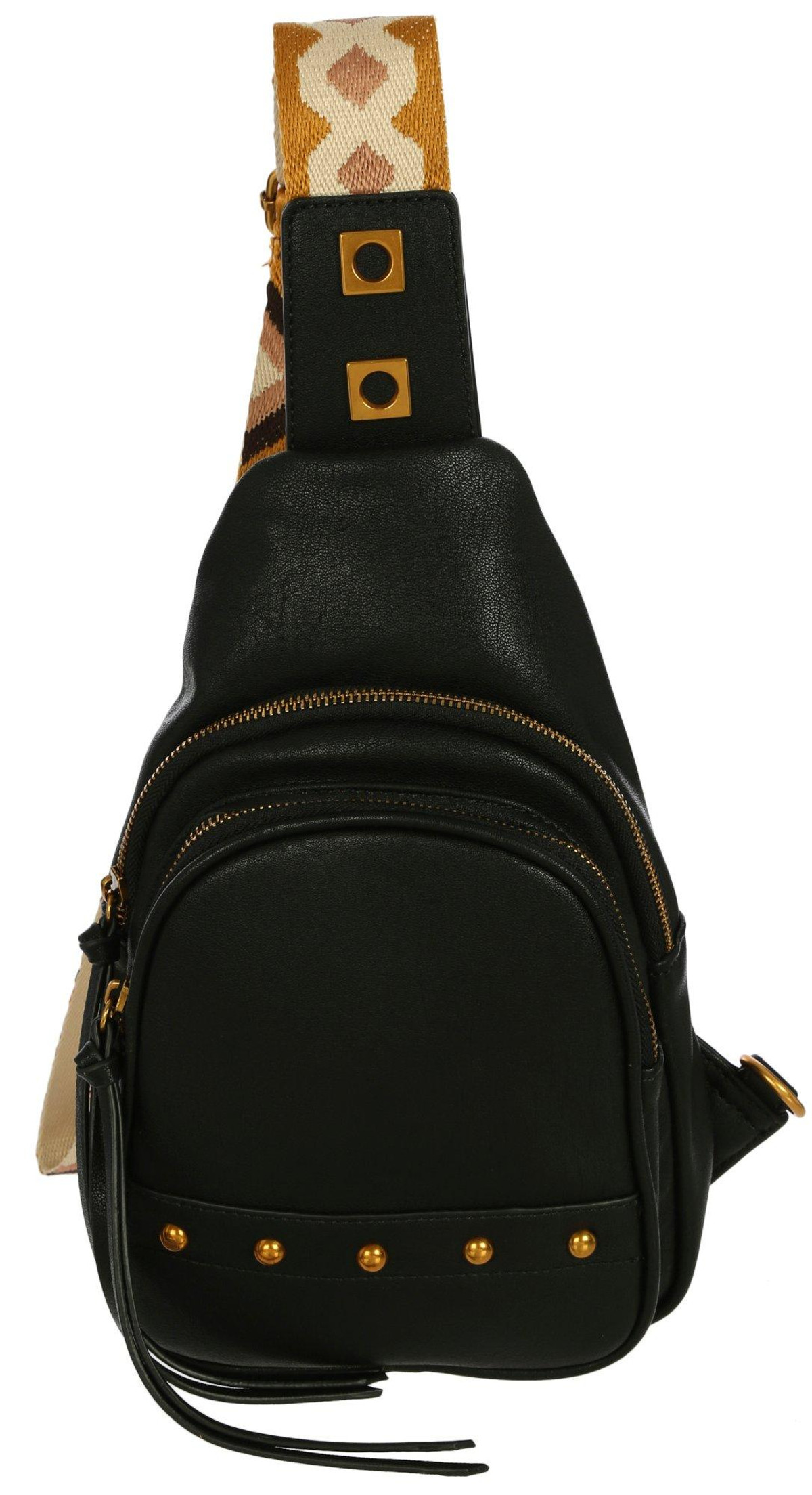 This stylish sling bag features a solid vegan leather exterior, gold tone hardware, a guitar strap style strap, top zip compartment and front zip pocket. Measures 8 x 12 in.