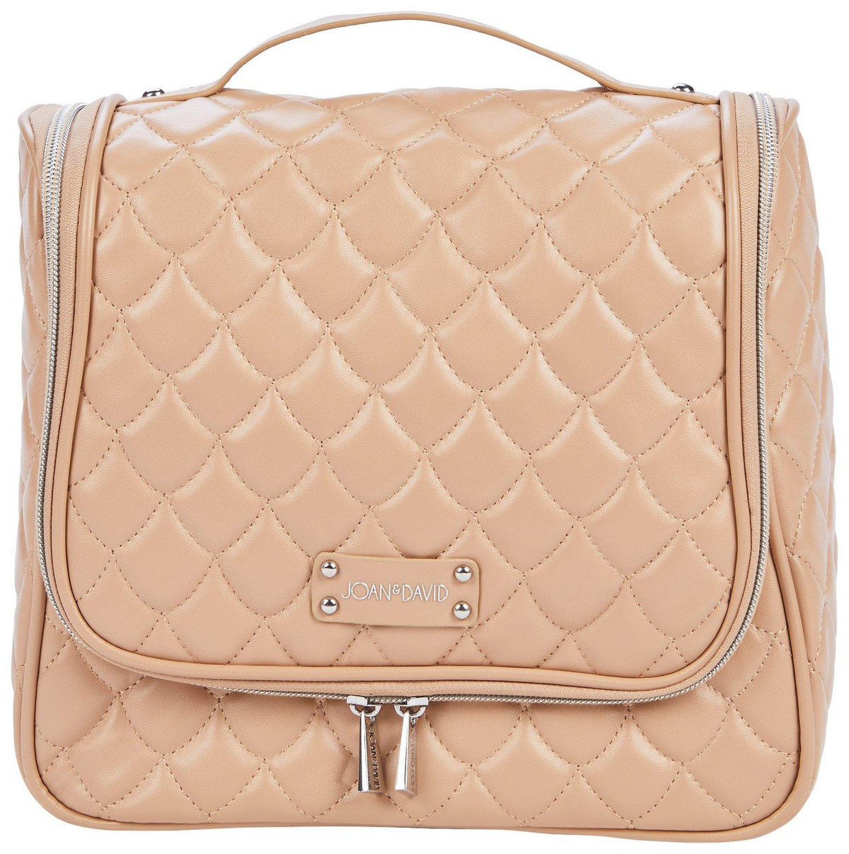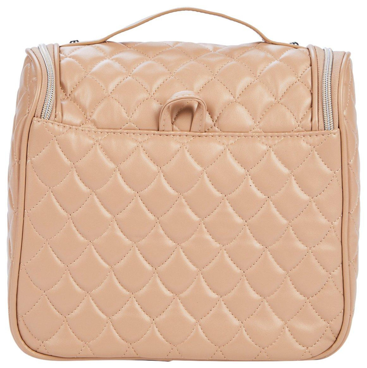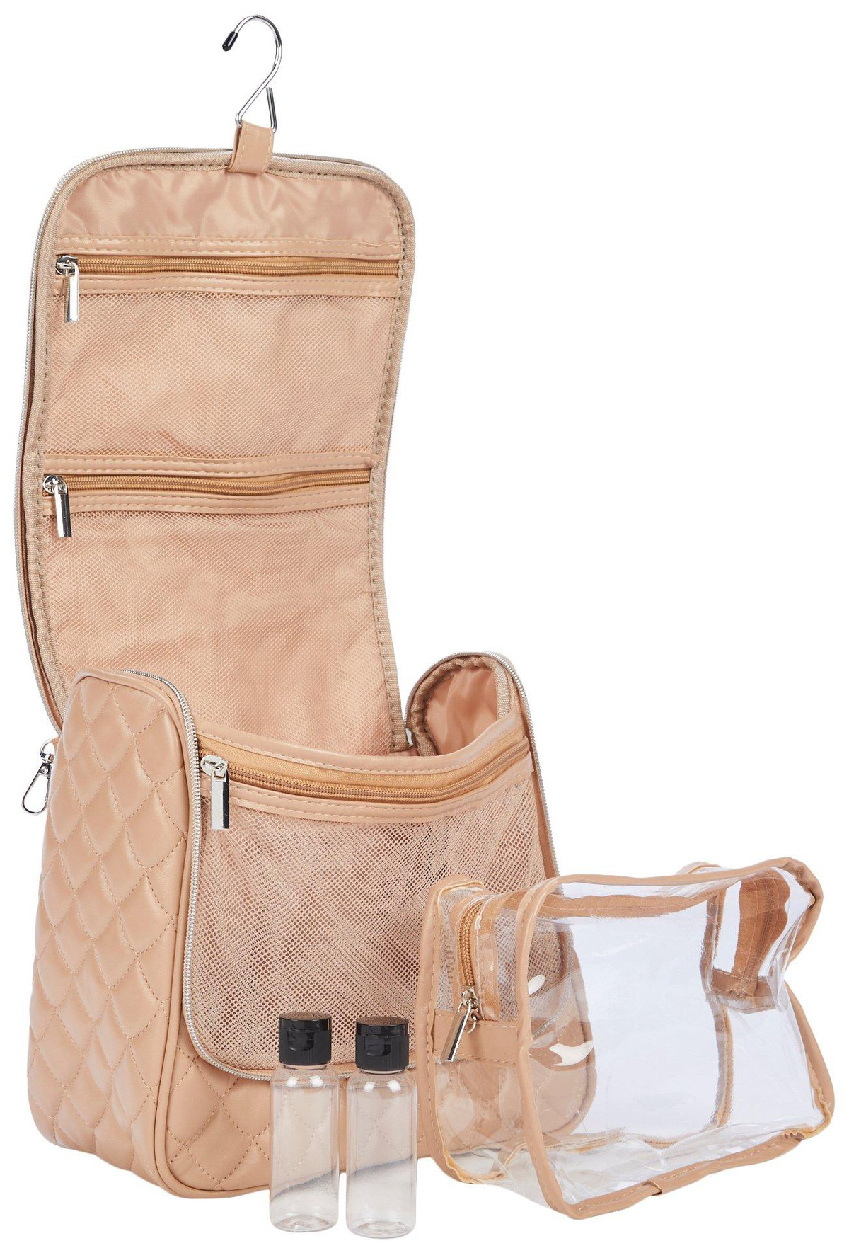 Travel in style with this toiletry bag featuring a solid color with a quilted design. Perfect for organizing your beauty essentials, the interior features (4) elasticized slip pockets and (3) spacious mesh zippered pockets. The durable material ensures long-lasting use. Features a metal hook for easy hanging. Includes bonus detachable zippered pouch and (2) travel size bottles. Measures approximately 10 in x 5 in x 9.5 in.