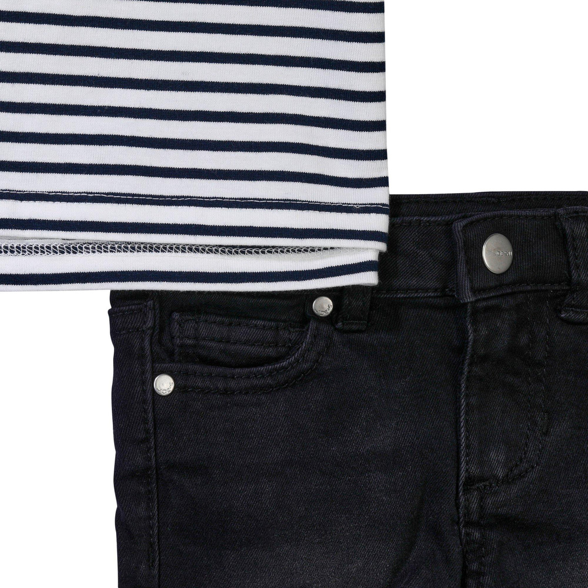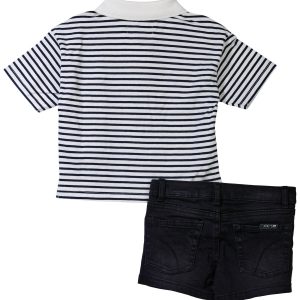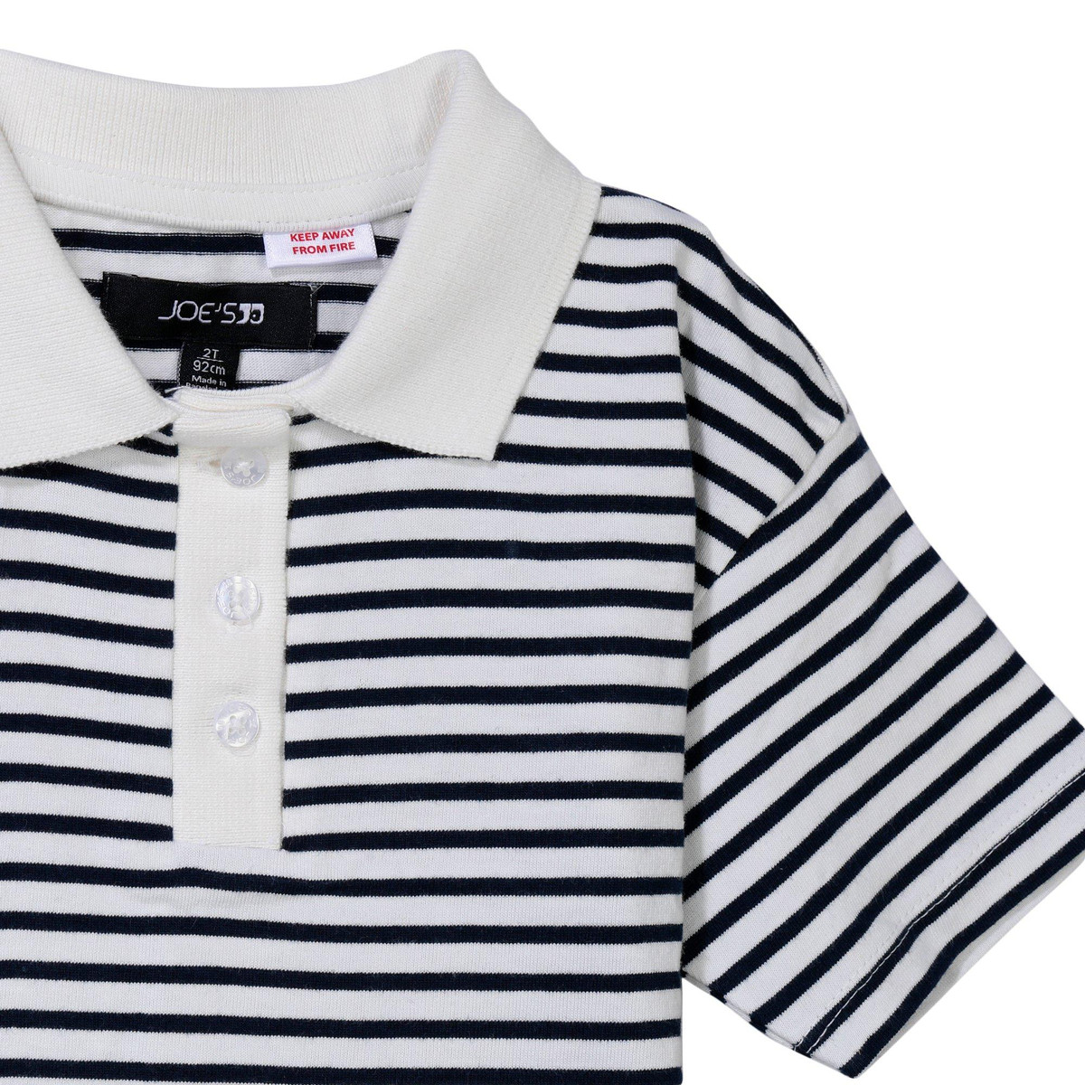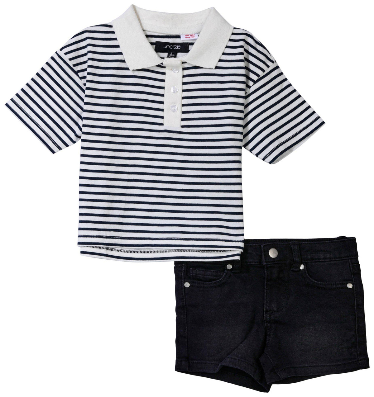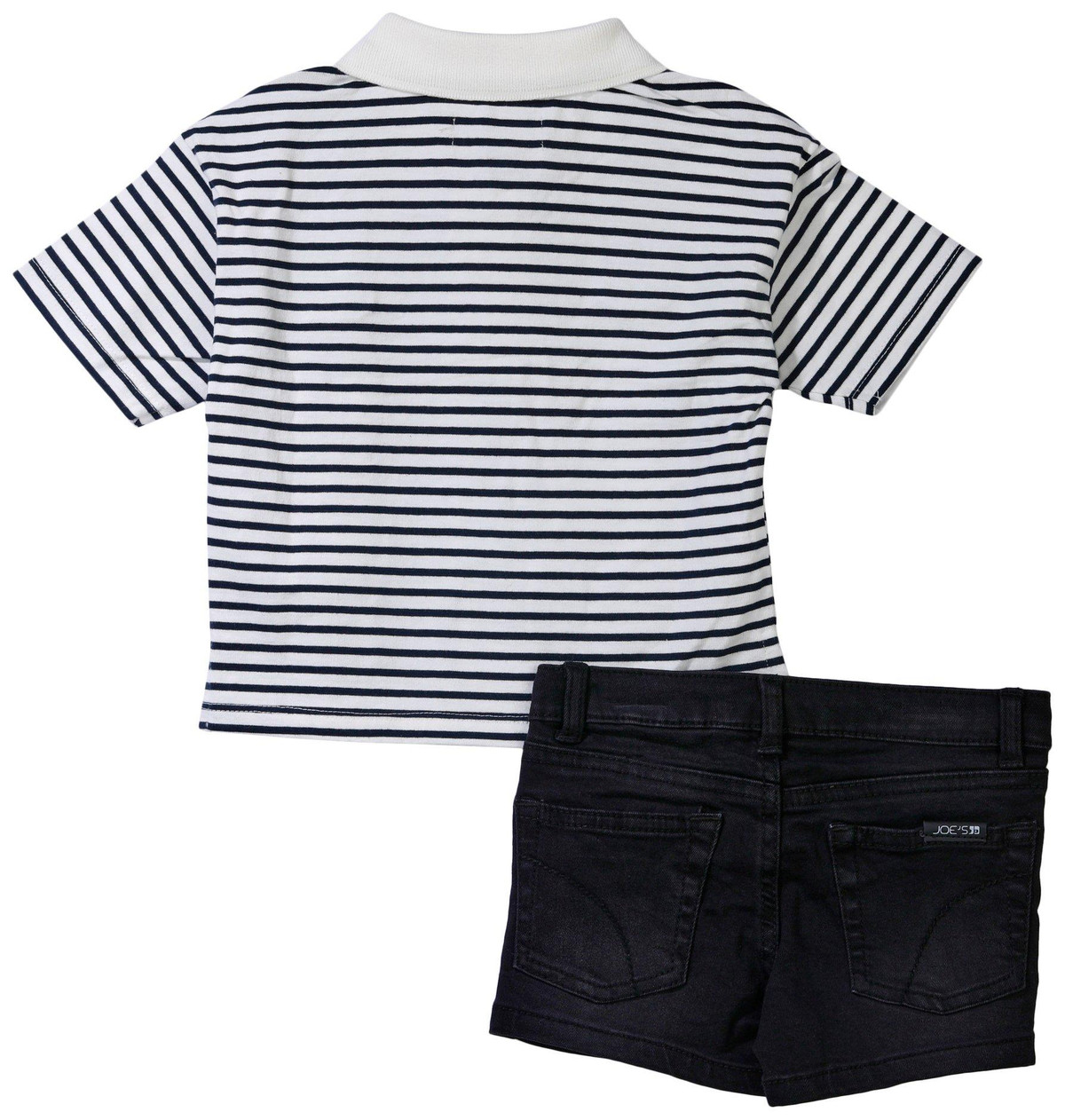 This 2 pc toddler girl set from Joes features a chic black and white striped polo shirt paired with classic black jean shorts. The shorts include five functional pockets and an adjustable waist for a perfect fit. Stylish and practical, this outfit is ideal for playdates, outings, or everyday charmperfect for moms who want fashion and function in one.
